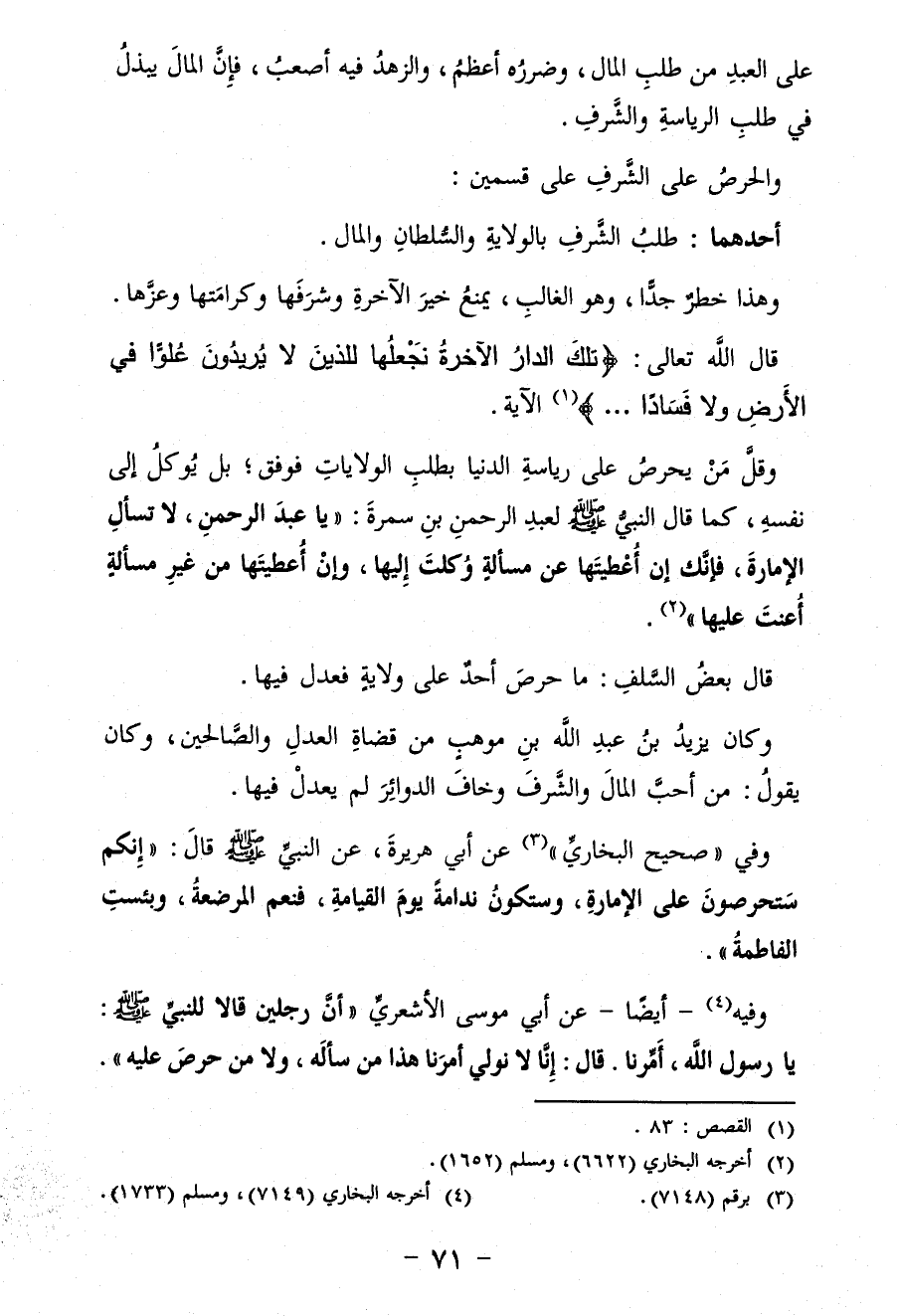 وقلَّ مَنْ يحرصُ عَلَى رياسةِ الدُّنْيَا بطلبِ الولاياتِ فوفق؛ بل يُوكلُ إِلَى نفسهِ، كما قال النبيُّ -صلى الله عليه وسلم- لعبد الرحمنِ بن سمرةَ: "يا عبدَ الرحمنِ، لا تسألِ الإمارةَ، فإِنَّكَ إِن أُعْطيتَهَا عن مَسألةٍ وُكّلتَ إليها، وإنْ أُعْطيتَهَا من غير مسألةٍ أُعنتَ عليها" (¬2).