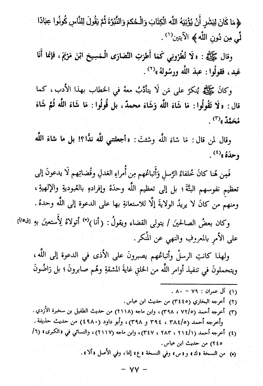 {مَا كَانَ لِبَشَرٍ أَنْ يُؤْتِيَهُ اللَّهُ الْكِتَابَ وَالْحُكْمَ وَالنُّبُوَّةَ ثُمَّ يَقُولَ لِلنَّاسِ كُونُوا عِبَادًا لِي مِنْ دُونِ اللَّهِ} [آل عمران: 79] الآيتين (¬1).