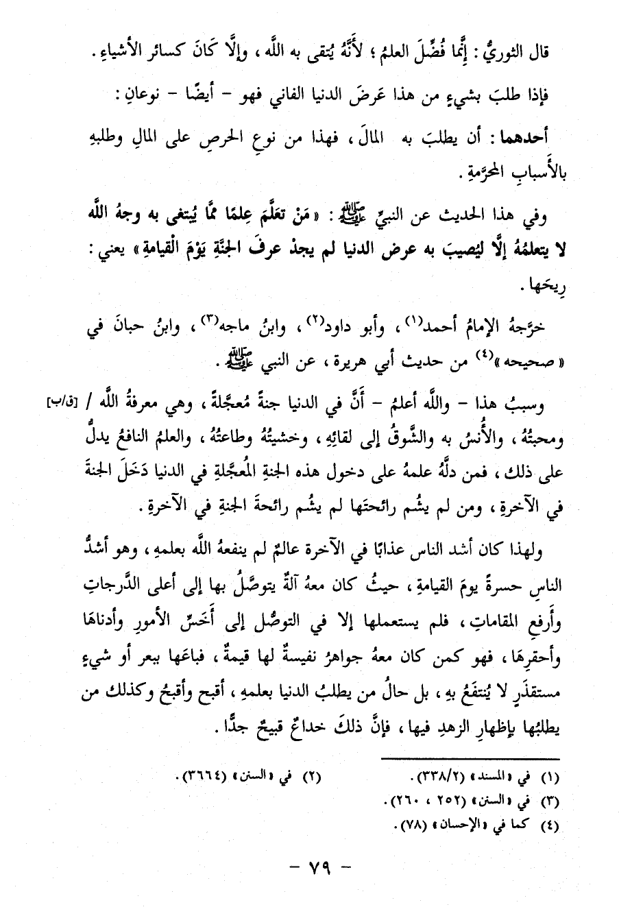 وفي هذا الحديث عن النبيّ - صلى الله عليه وسلم -: " «مَنْ تَعَلَّمَ عِلْمًا مِمَّا يُبْتَغَى بِهِ وَجْهُ اللَّهِ لَا يَتَعَلَّمُهُ إِلَّا لِيُصِيبَ بِهِ عَرَضَ الدُّنْيَا لَمْ يَجِدْ عَرْفَ الْجَنَّةِ يَوْمَ الْقِيَامَةِ» يعني: رِيحَها.
