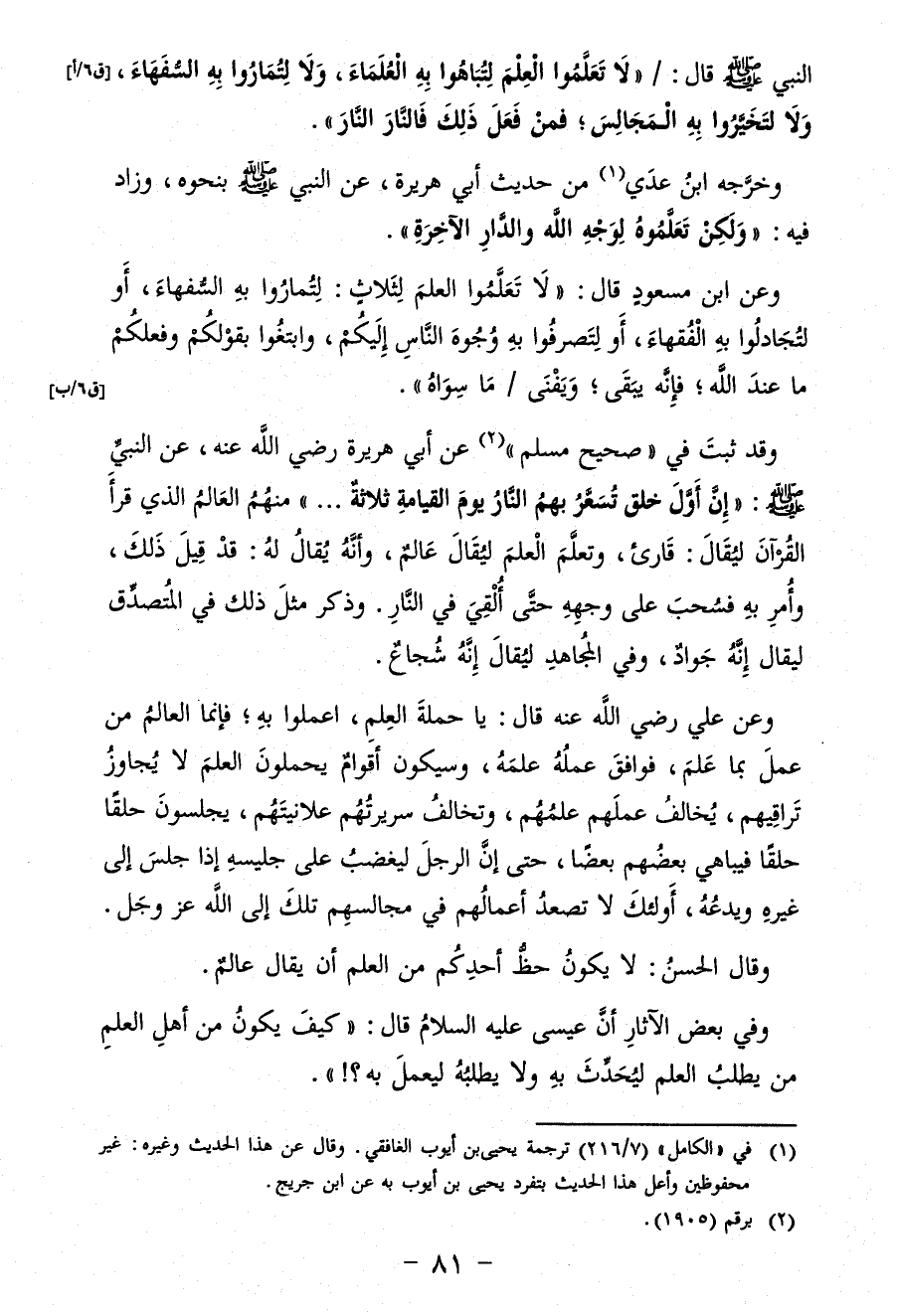 -صلى الله عليه وسلم-: "إِن أَوّلَ خلق تُسَعَّرُ بهمُ النَّارُ يومَ القيامةِ ثلاثة ... " منهُمُ العَالمُ الَّذِي قرأَ