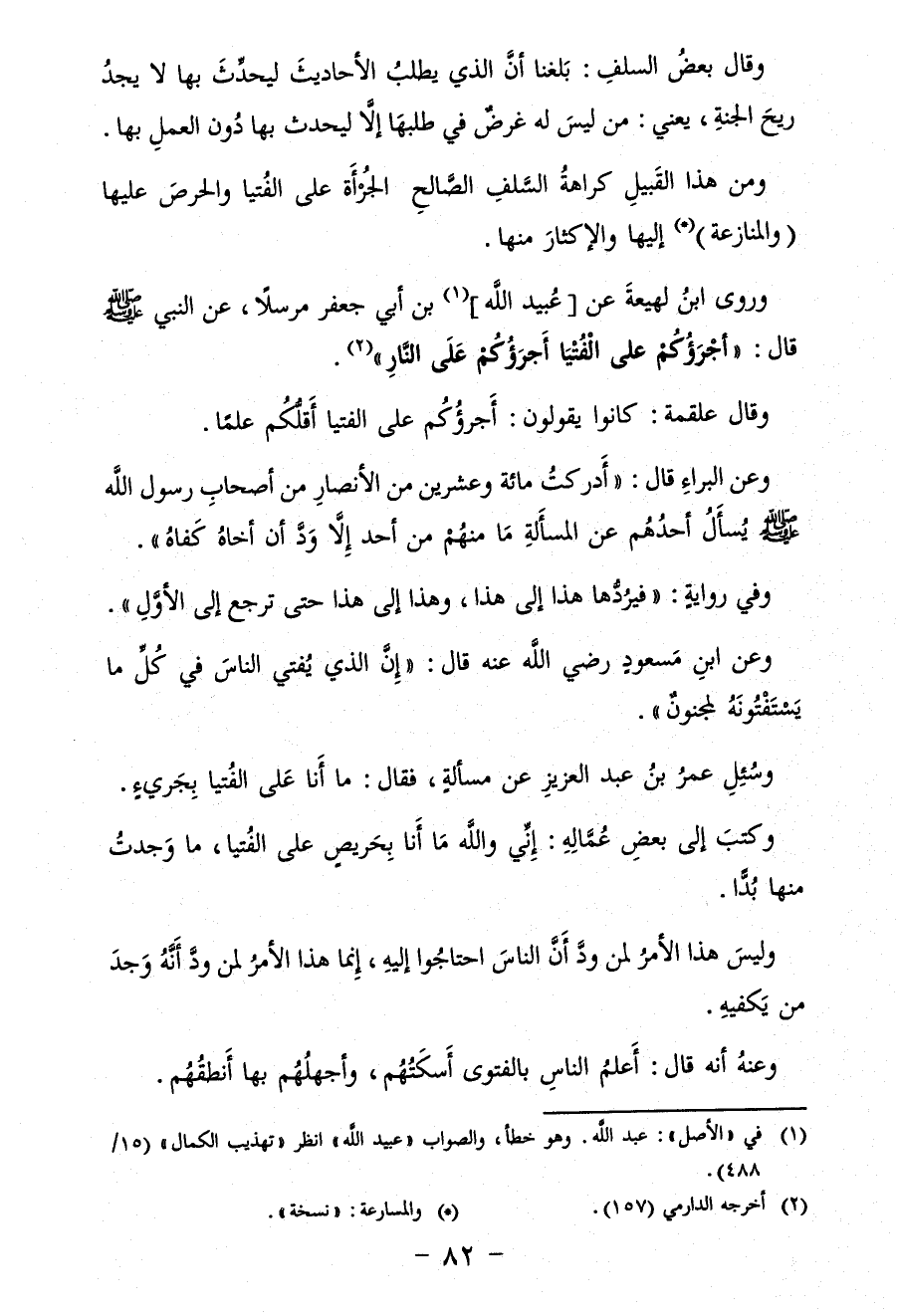 ومن هذا القَبيلِ كراهةُ السَّلفِ الصَّالحِ الجُرْأَة عَلَى الفُتيا والحرصَ عليها (والمنازعة) (*) إليها والإكثارَ منها.