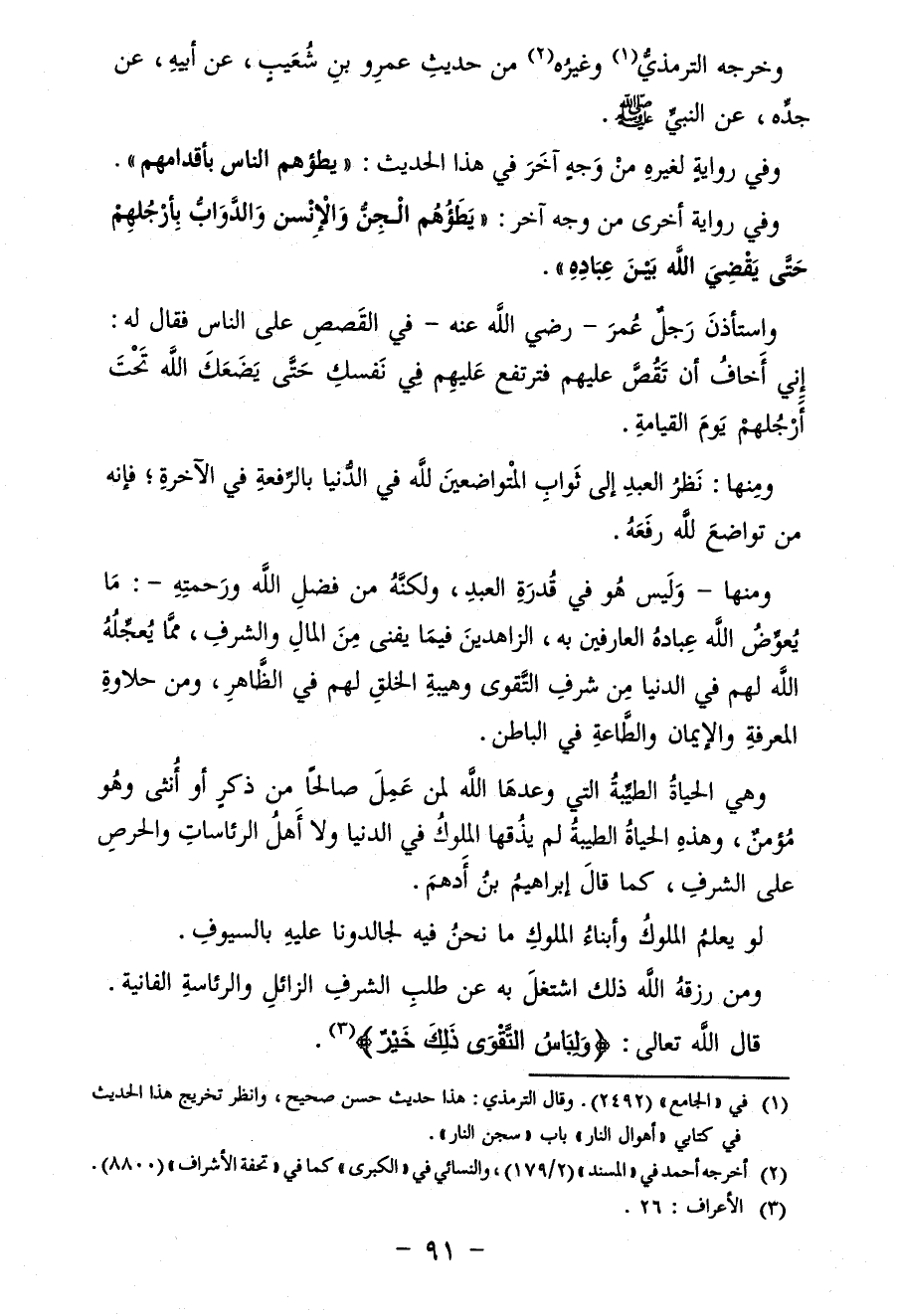 واستأذنَ رَجل عُمرَ -رضي اللَّه عنه- في القَصصِ عَلَى الناس فَقَالَ له: إِني أَخافُ أن تَقُصَّ عليهم فترتفع عَليهِم في نَفسكِ حَتَّى يَضَعَكَ اللَّه تَحْتَ أَرْجُلهمْ يَومَ القيامةِ.