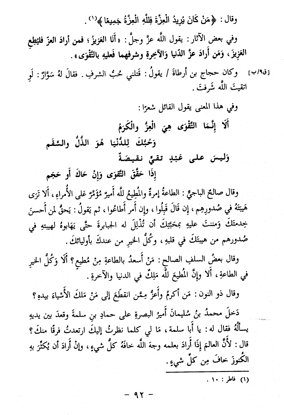 وفي بعض الآثار: يقول الله عز وجل: "أَنَا العَزيزُ؛ فمن أرادَ العزّ فليُطِعِ العَزيزَ، وَمَن أَرادَ عزَّ الدُّنيا وَالآخِرةِ وشرفهما فَعليهِ بالتَّقْوَى".