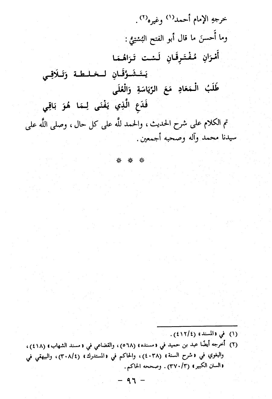 تم الكلام عَلَى شرح الحديث، والحمد لله عَلَى كل حال، وصلى الله عَلَى سيدنا محمد وآله وصحبه أجمعين.