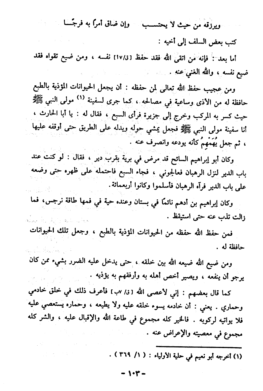 ومن عجيب حفظ الله تعالى لمن حفظه: أن يجعل الحيوانات المؤذية بالطبع حافظة له من الأذى وساعية في مصالحه، كما جرى لسفينة (¬1) مولى النبي صلّى الله عليه وسلم حيث كسر به المركب وخرج إِلَى جزيرة فرأى السبع، فَقَالَ له: يا أبا الحارث، أنا سفينة مولى النبي - صلى الله عليه وسلم - فجعل يمشي حوله ويدله عَلَى الطريق حتى أوقفه عليها، ثم جعل يُهَمْهِمُ كأنه يودعه وانصرف عنه.