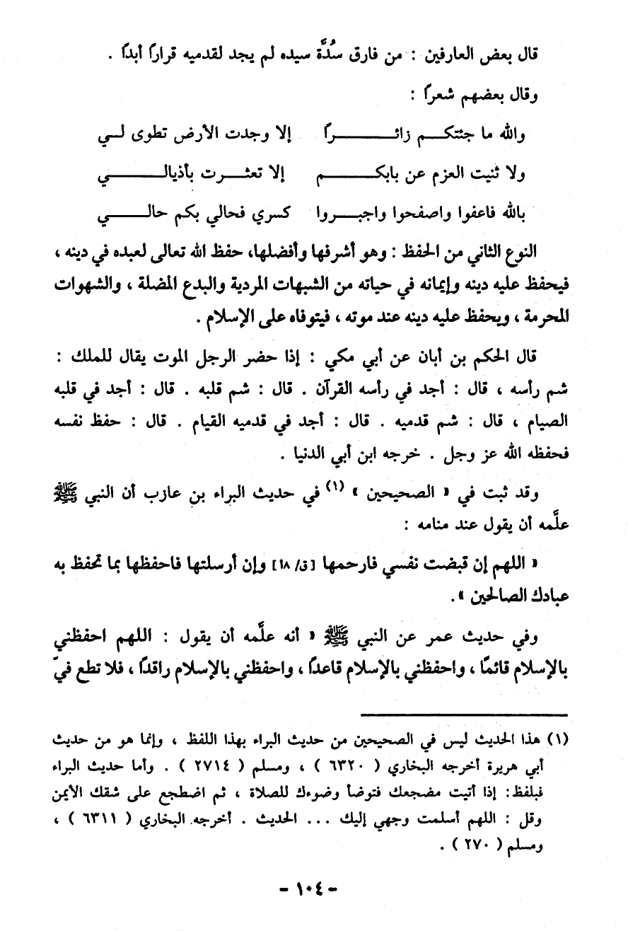 وفي حديث عمر عن النَّبِيَّ صَلَّى اللَّهُ عَلَيْهِ وَسَلَّمَ "أَنَّهُ عَلَّمَهُ أَنْ يَقُولَ: اللَّهُمَّ احْفَظْنِي بِالْإِسْلَامِ قَائِمًا، وَاحْفَظْنِي بِالْإِسْلَامِ قَاعِدًا، وَاحْفَظْنِي بِالْإِسْلَامِ رَاقِدًا، فَلاَ تُطِعْ فِيَّ