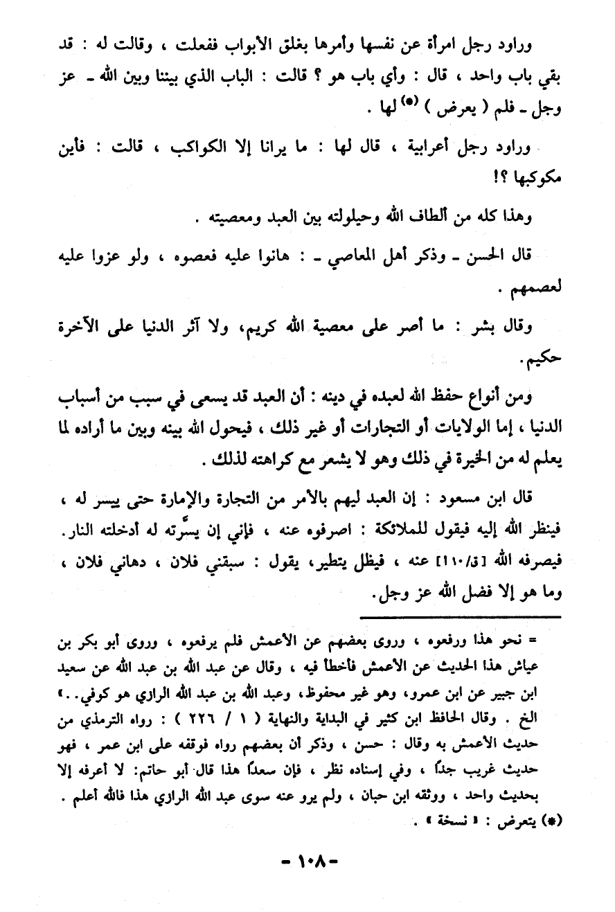 وراود رجل امرأة عن نفسها وأمرها بغلق الأبواب ففعلت، وقالت له: قد بقي باب واحد، قال: وأي باب هو؟ قالت: الباب الَّذِي بيننا وبين الله -عز وجل- فلم (يعرض) (*) لها.