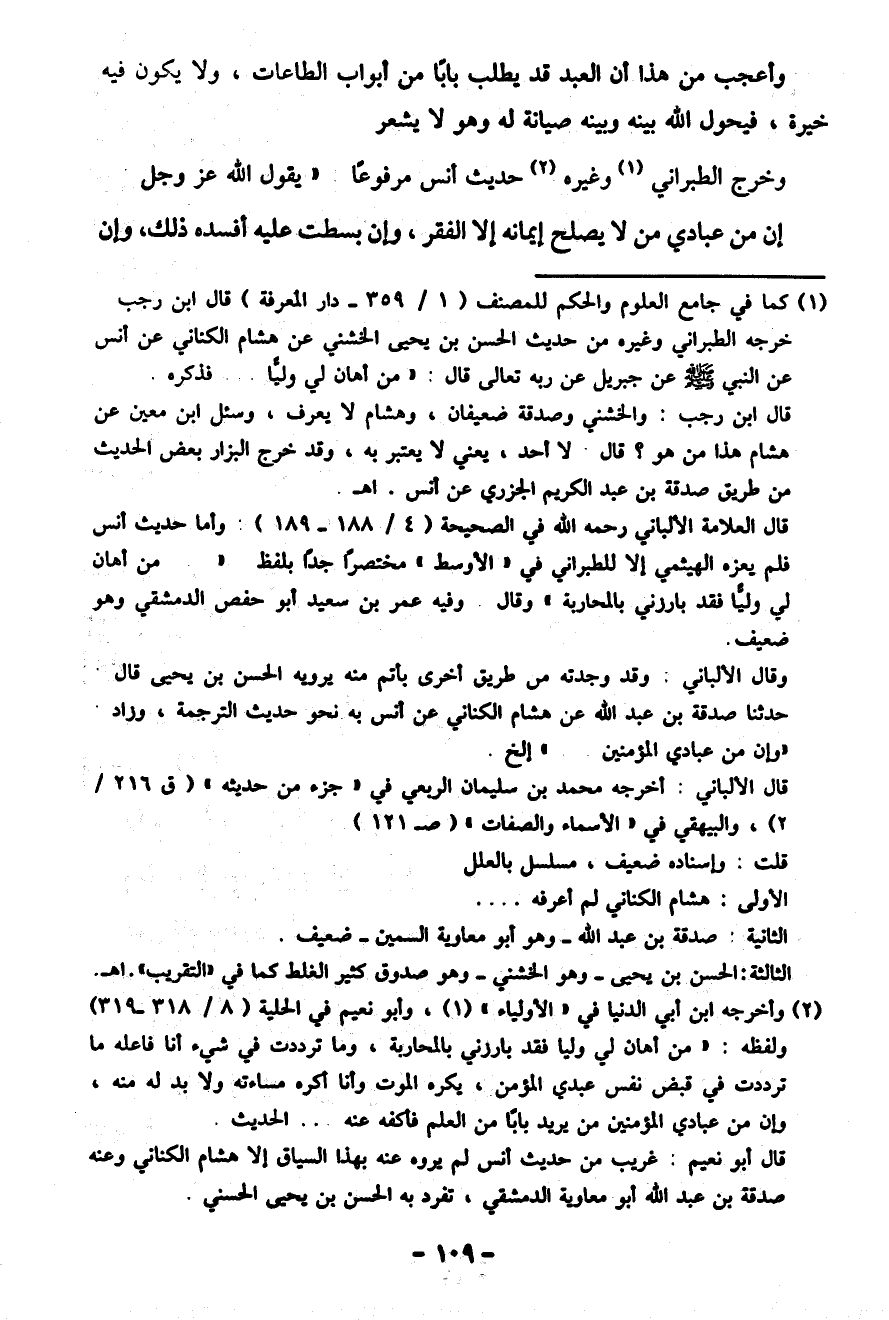 وقال الألباني: وقد وجدته من طريق أخرى بأتم منه يرويه الحسن بن يحيى قال حدثنا صدقة بن عبد الله عن هشام الكناني عن أنس به نحو حديث الترجمة، وزاد "وإن من عبادي المومنين" الخ.