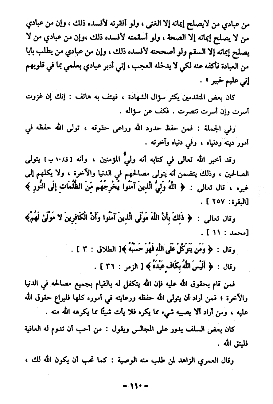 وقد أخبر الله تعالى في كتابه أنَّه وليُّ المؤمنين، وأنه يتولى الصالحين، وذلك يتضمن أنَّه يتولى مصالحهم في الدُّنْيَا والآخرة، ولا يكلهم إِلَى غيره، قال تعالى: {اللَّهُ وَلِيُّ الَّذِينَ آمَنُوا يُخْرِجُهُمْ مِنَ الظُّلُمَاتِ إِلَى النُّورِ} [البقرة: 257].