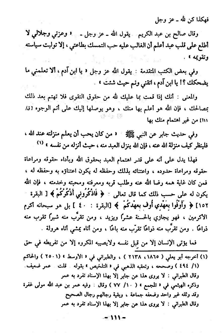 وقال صالح بن عبد الكريم يقول الله -عز وجل- "وعزتي وجلالي لا أطلع عَلَى قلب عبد أعلم أن الغالب عليه حب التمسك بطاعتي، إلا توليت سياسته وتقويمه".