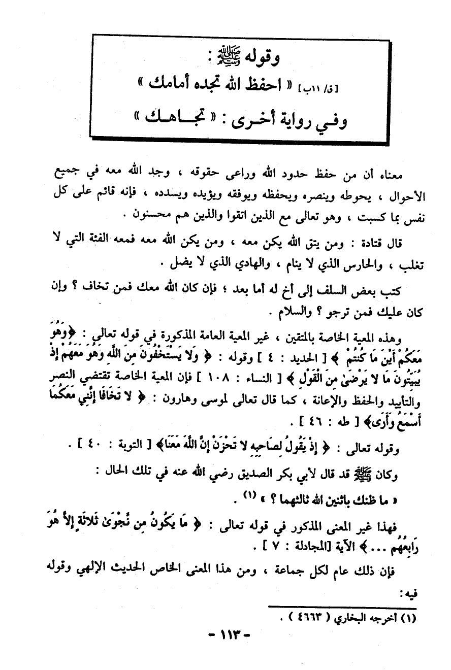 وقوله - صلى الله عليه وسلم -: "احفظ الله تجده أمامك" وفي رواية أخرى: "تجاهك"