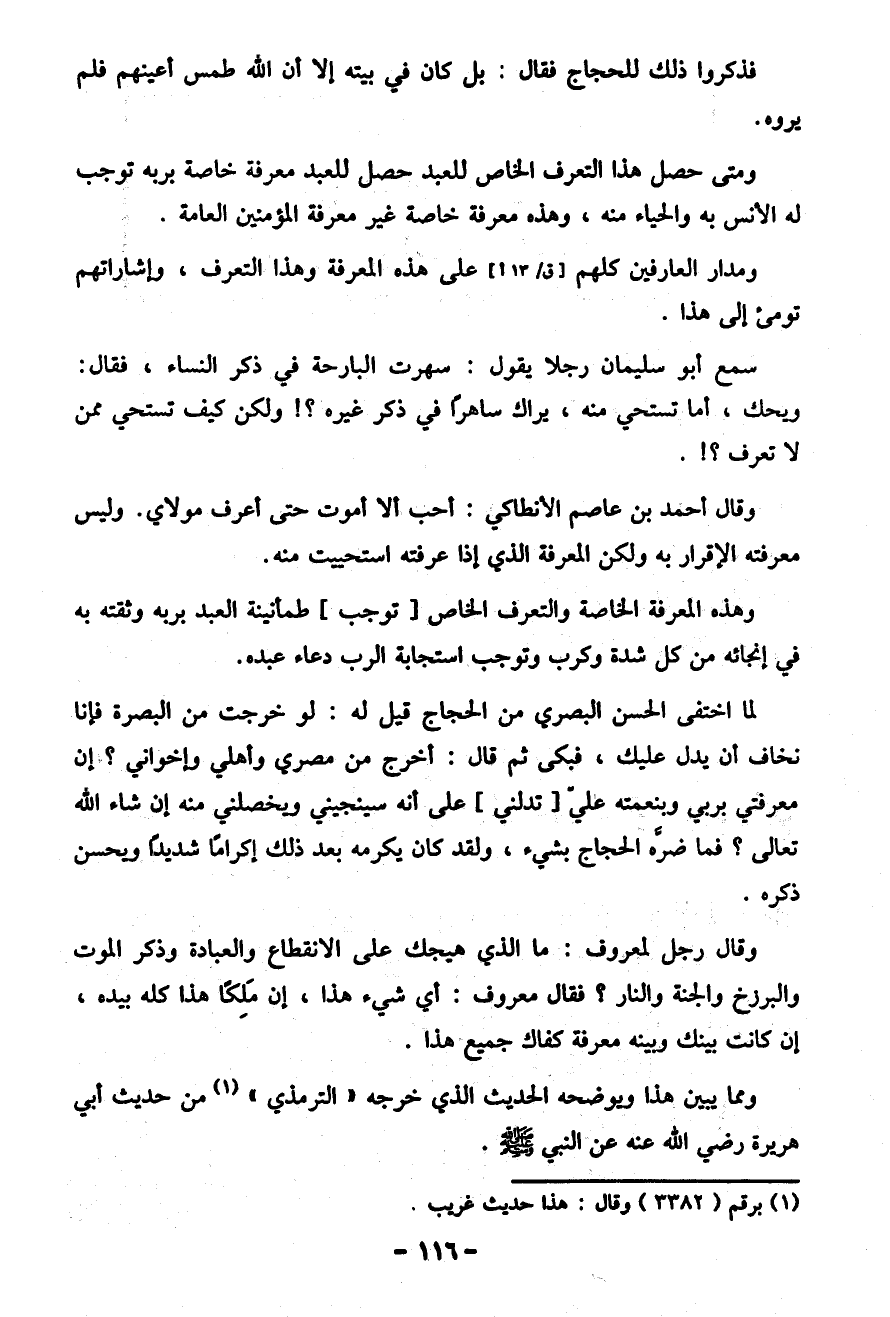 وقال أحمد بن عاصم الأنطاكي: أَحَبّ ألا أموت حتى أعرف مولاي. وليس معرفته الإقرار به ولكن المعرفة الَّذِي إذا عرفته استحييت منه.