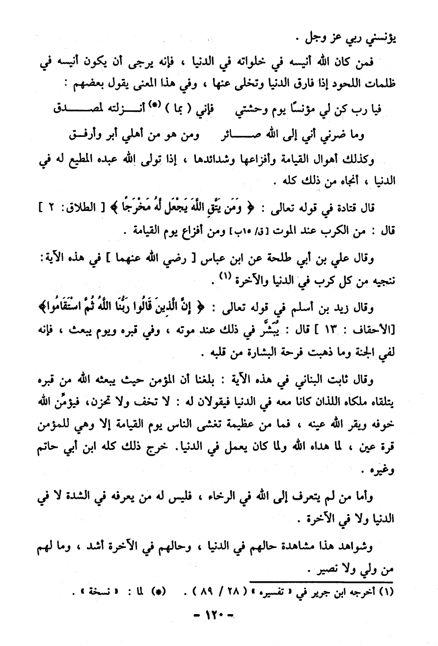 فمن كان الله أنيسه في خلواته في الدُّنْيَا، فإنَّه يرجى أن يكون أنيسه في ظلمات اللحود إذا فارق الدُّنْيَا وتخلى عنها، وفي هذا المعنى يقول بعضهم:
