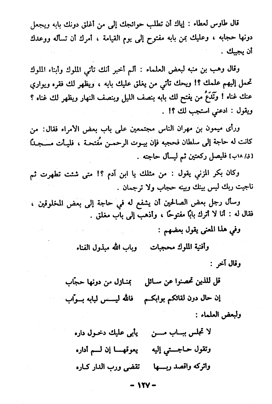 قال طاوس لعطاء: إياك أن تطلب حوائجك إِلَى من أغلق دونك بابه ويجعل دونها حجابه، وعليك بمن بابه مفتوح إِلَى يوم القيامة، أمرك أن تسأله ووعدك أن يجيبك.