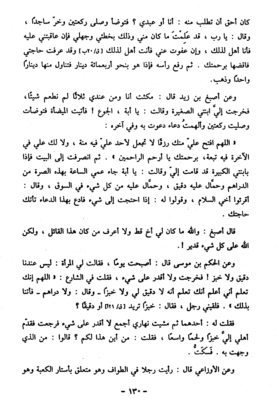 "اللهم افتح عَلَيّ منك رزقًا لا تجعل لأحد عليّ فيه منة، ولا لك علي في الآخرة فيه تبعة، برحمتك يا أرحم الراحمين". ثم انصرفت إِلَى البيت فإذا بابنتي الكبيرة قد قامت إِلَيّ وقالت: يا أبة جاء عمي الساعة بهذه الصرة من الدراهم وحمَّال عليه دقيق، وحمَّال عليه من كل شيء في السوق، وقال: أقرئوا أخي السلام، وقولوا له: إذا احتجت إِلَى شيء فادع بهذا الدعاء تأتك حاجتك.