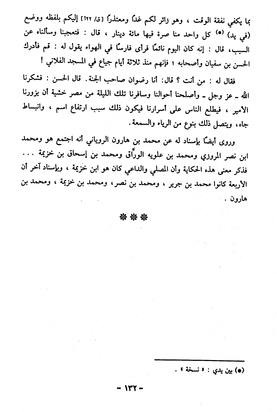 وروى أيضاً بإسناد له عن محمد بن هارون الروياني أنَّه اجتمع هو ومحمد ابن نصر المروزي ومحمد بن علويه الورَّاق ومحمد بن إسحاق بن خزيمة ... فذكر معنى هذه الحكاية وأن المصلي والداعي كان هو ابن خزيمة، وبإسناد آخر أن الأربعة كانوا محمد بن جرير، ومحمد بن نصر، ومحمد بن خزيمة، ومحمد بن هارون.