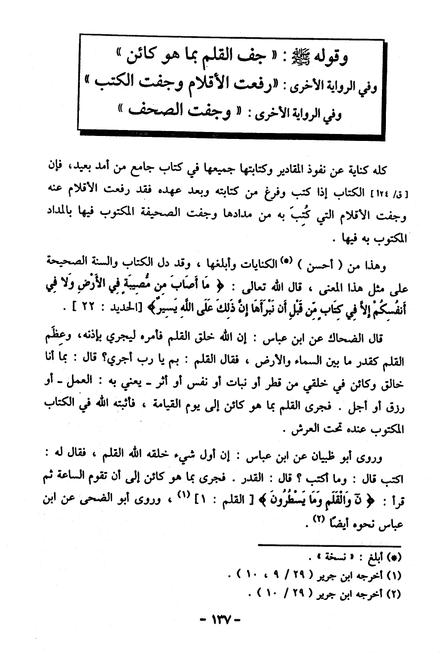 وقوله - صلى الله عليه وسلم -: "جف القلم بما هو كائن" وفي الرواية الأخرى: "رفعت الأقلام وجفت الكتب" وفي الرواية الأخرى: "وجفت الصحف"