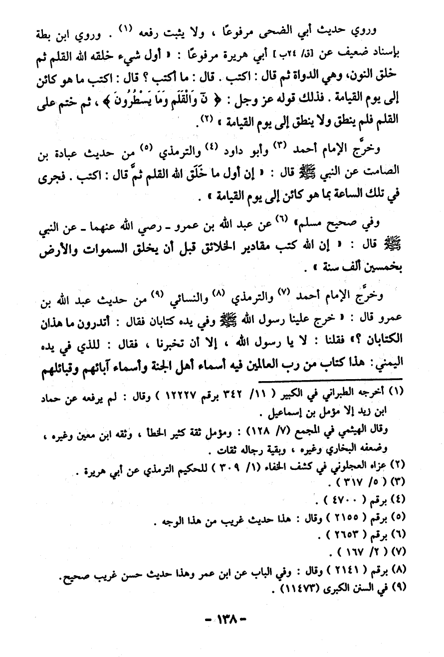 وخرَّج الإمام أحمد (¬3) وأبو داود (¬4) والترمذي (¬5) من حديث عبادة بن الصامت عن النبي صلّى الله عليه وسلم قال: "إِنَّ أَوَّلَ مَا خَلَقَهُ اللَّهُ الْقَلَمُ ثُمَّ قَالَ: اكْتُبْ. فَجَرَى فِي تِلْكَ اَلسَّاعَةِ بِمَا هُوَ كَائِنٌ إِلَى يَوْمٍ اَلْقِيَامَةِ".