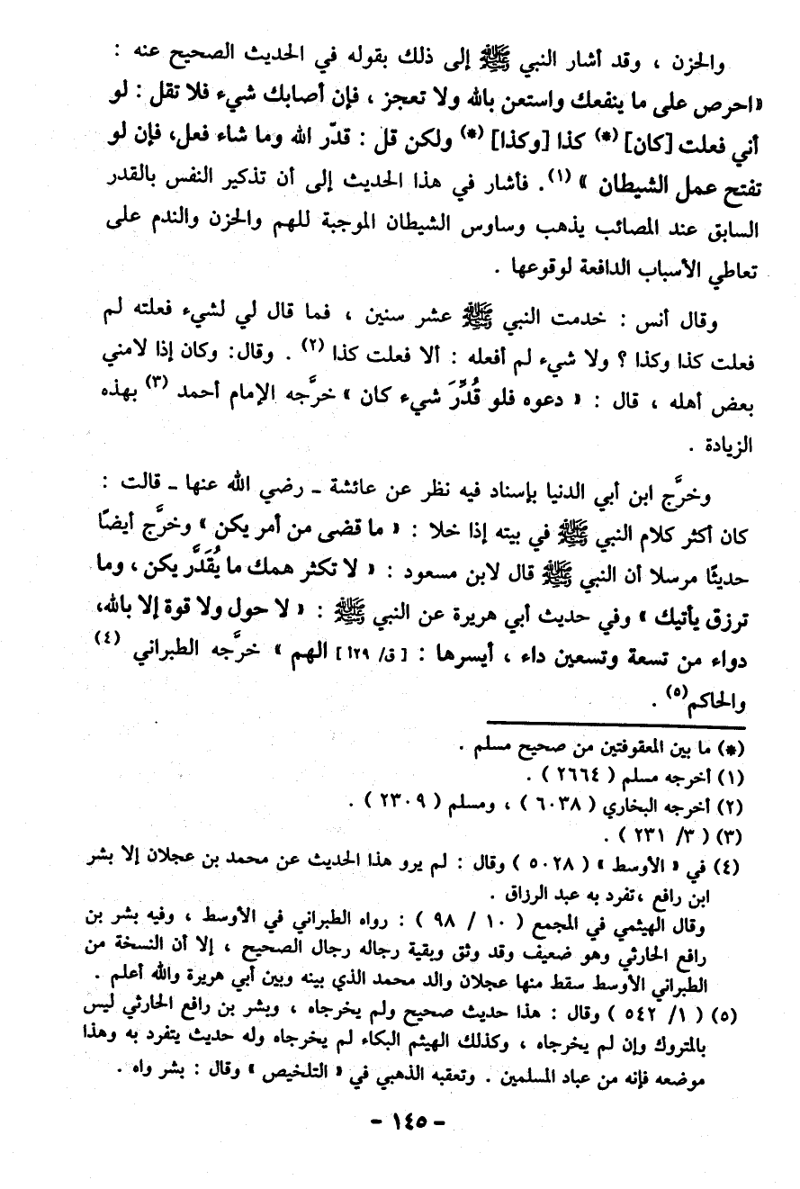 والحزن، وقد أشار النبي صلّى الله عليه وسلم إِلَى ذلك بقوله في الحديث الصحيح عنه: "احْرِصْ عَلَى مَا يَنْفَعُكَ وَاسْتَعِنْ بِاللهِ وَلَا تَعْجَزْ، فَإِنْ أَصَابَكَ شَيْءٌ فَلَا تَقُلْ: لَوْ أَنِّي فَعَلْتُ [كَانَ] (*) كَذَا [وَكَذَا] (*) وَلَكِنْ قُلْ: قَدَرُ اللهِ وَمَا شَاءَ فَعَلَ، فَإِنَّ لَوْ تَفْتَحُ عَمَلَ الشَّيْطَانِ" (¬1). فأشار في هذا الحديث إِلَى أن تذكير النفس بالقدر السابق عند المصائب يذهب وساوس الشيطان الموجبة للهم والحزن والندم عَلَى تعاطي الأسباب الدافعة لوقوعها.