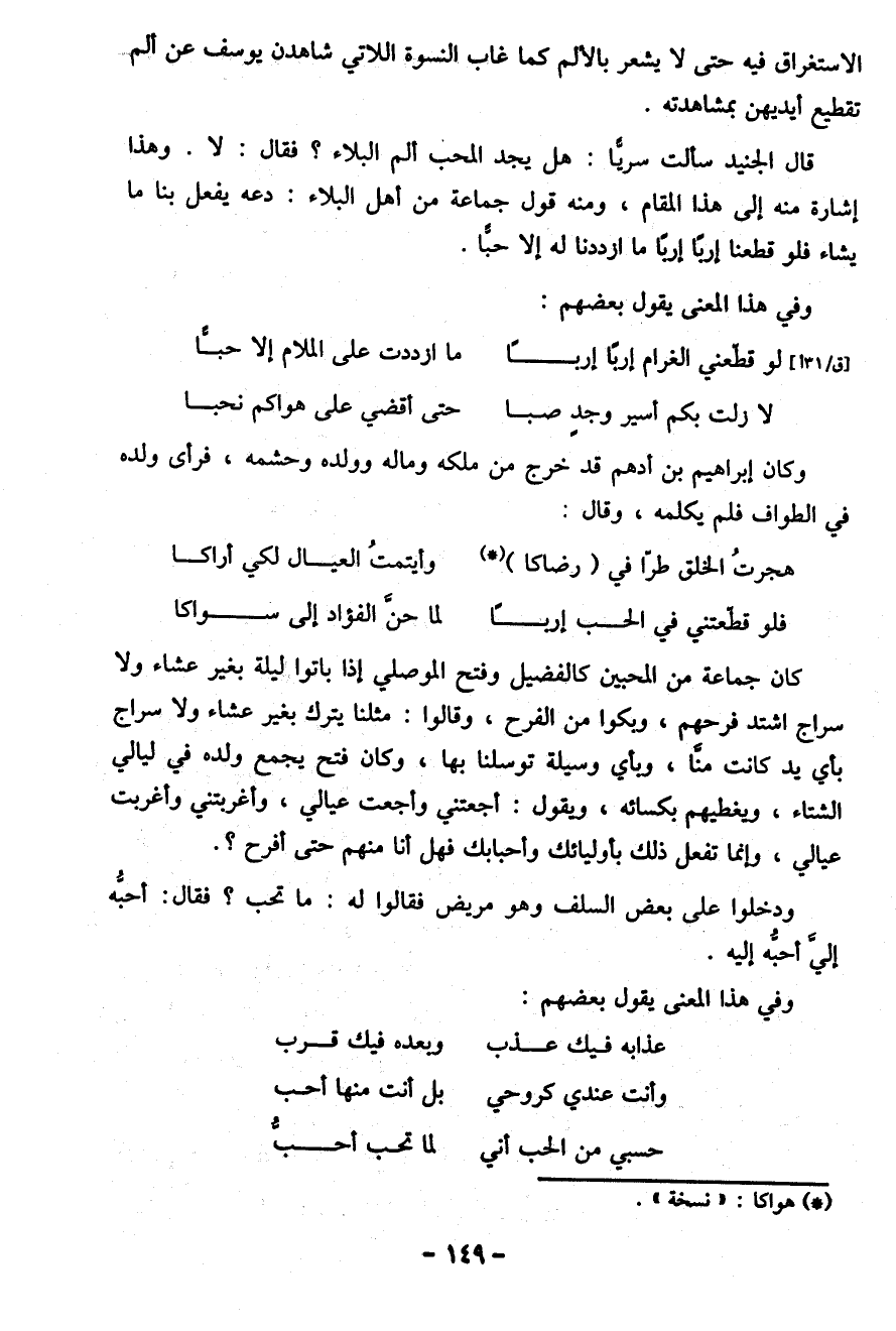 قال الجنيد سألت سريًّا: هل يجد المحب ألم البلاء؟ فَقَالَ: لا. وهذا إشارة منه إِلَى هذا المقام، ومنه قول جماعة من أهل البلاء: دعه يفعل بنا ما يشاء فلو قطعنا إربًا إربًا ما ازددنا له إلا حبًّا.