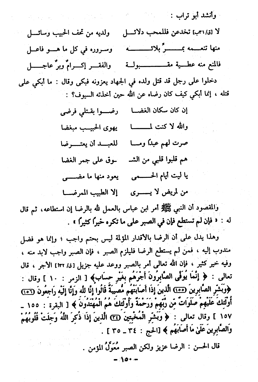 وهذا يدل عَلَى أن الرضا بالأقدار المؤلمة ليس بحتم واجب؛ وإنَّما هو فضل مندوب إِلَيْهِ، فمن لم يستطع الرضا فليلزم الصبر، فإن الصبر واجب لابد منه، وفيه خير كثير، فإن الله تعالى أمر بالصبر ووعد عليه جزيل الأجر، قال تعالى: {إِنَّمَا يُوَفَّى الصَّابِرُونَ أَجْرَهُمْ بِغَيْرِ حِسَابٍ} [الزمر: 10] وقال: {وَبَشِّرِ الصَّابِرِينَ * الَّذِينَ إِذَا أَصَابَتْهُمْ مُصِيبَةٌ قَالُوا إِنَّا لِلَّهِ وَإِنَّا إِلَيْهِ رَاجِعُونَ * أُولَئِكَ عَلَيْهِمْ صَلَوَاتٌ مِنْ رَبِّهِمْ وَرَحْمَةٌ وَأُولَئِكَ هُمُ الْمُهْتَدُونَ} [البقرة: 155 - 157] وقال تعالى: {وَبَشِّرِ الْمُخْبِتِينَ * الَّذِينَ إِذَا ذُكِرَ اللَّهُ وَجِلَتْ قُلُوبُهُمْ وَالصَّابِرِينَ عَلَى مَا أَصَابَهُمْ} [الحج: 34، 35].