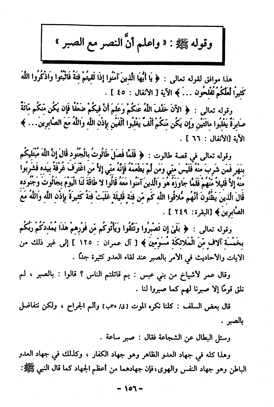 وقوله تعالى: {بَلَى إِنْ تَصْبِرُوا وَتَتَّقُوا وَيَأْتُوكُمْ مِنْ فَوْرِهِمْ هَذَا يُمْدِدْكُمْ رَبُّكُمْ بِخَمْسَةِ آلَافٍ مِنَ الْمَلَائِكَةِ مُسَوِّمِينَ} [آل عمران: 125] إِلَى غير ذلك من الآيات والأحاديث في الأمر بالصبر عند لقاء العدو كثيرة جدًا.