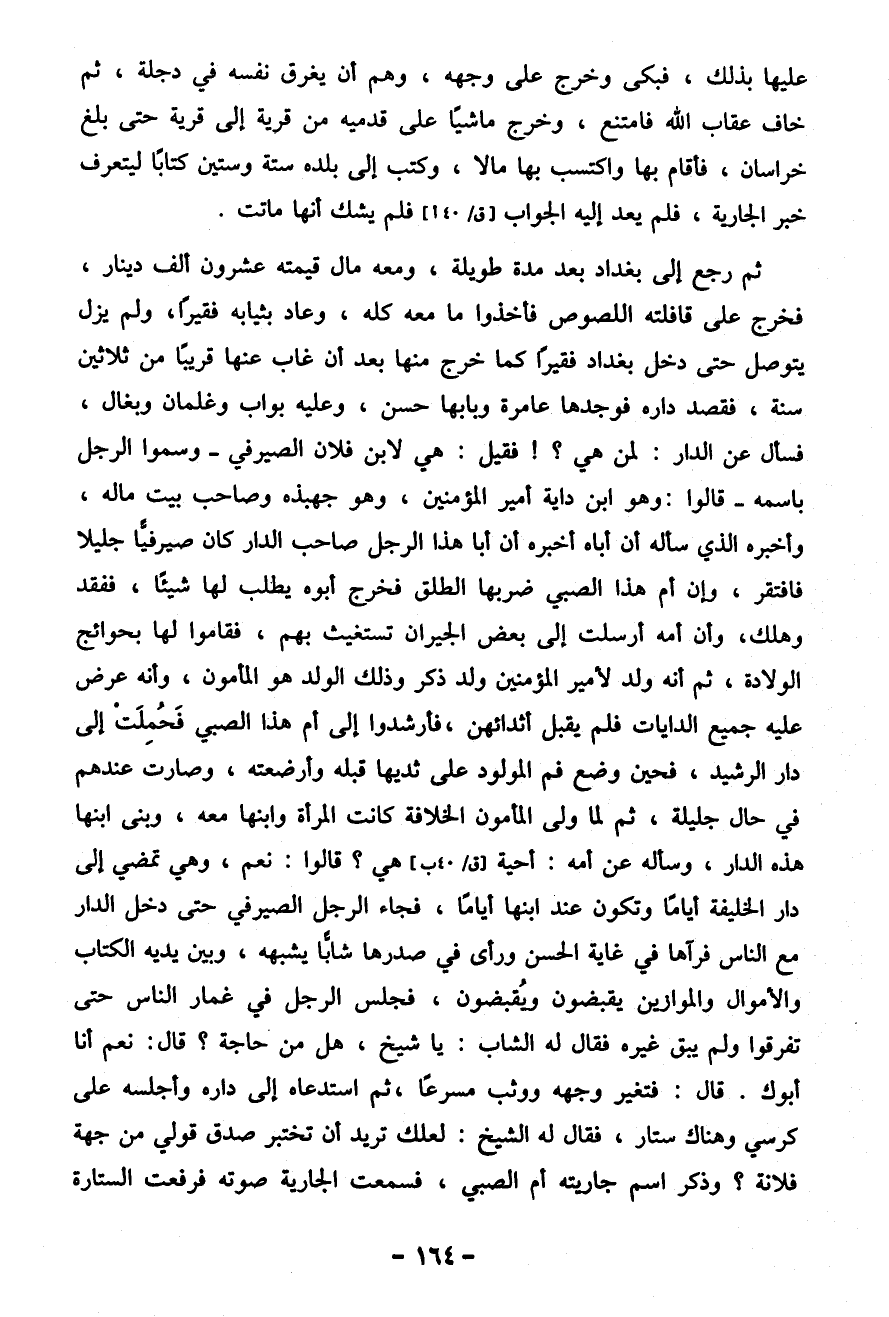 ثم رجع إِلَى بغداد بعد مدة طويلة، ومعه مال قيمته عشرون ألف دينار، فخرج عَلَى قافلته اللصوص فأخذوا ما معه كله، وعاد بثيابه فقيرًا، ولم يزل يتوصل حتى دخل بغداد فقيرًا كما خرج منها بعد أن غاب عنها قريبًا من ثلاثين سنة، فقصد داره فوجدها عامرة وبابها حسن، وعليه بواب وغلمان وبغال، فسأل عن الدار: لمن هي؟! فقيل: هي لابن فلان الصيرفي -وسموا الرجل باسمه- قالوا: وهو ابن داية أمير المؤمنين، وهو جهبذه وصاحب بيت ماله، وأخبره الَّذِي سأله أن أباه أخبره أن أبا هذا الرجل صاحب الدار كان صيرفيًّا جليلا فافتقر، وإن أم هذا الصبي ضربها الطلق فخرج أبوه يطلب لها شيئًا، ففقد وهلك، وأن أمه أرسلت إِلَى بعض الجيران تستغيث بهم، فقاموا لها بحوائج الولادة، ثم أنَّه ولد لأمير المؤمنين ولد ذكر وذلك الولد هو المأمون، وأنه عرض عليه جميع الدايات فلم يقبل أثدائهن، فأرشدوا إِلَى أم هذا الصبي فَحُمِلَت إِلَى دار الرشيد، فحين وضع فم المولود عَلَى ثديها قبله وأرضعته، وصارت عندهم في حال جليلة، ثم لما ولى المأمون الخلافة كانت المرأة وابنها معه، وبنى ابنها هذه الدار، وسأله عن أمه: أحية هي؟ قالوا: نعم، وهي تمضي إِلَى دار الخليفة أيامًا وتكون عند ابنها أيامًا، فجاء الرجل الصيرفي حتى دخل الدار مع الناس فرآها في غاية الحسن ورأى في صدرها شابًّا يشبهه، وبين يديه الكتاب والأموال والموازين يقبضون ويُقبضون، فجلس الرجل في غمار الناس حتى تفرقوا ولم يبق غيره فَقَالَ له الشاب: يا شيخ، هل من حاجة؟ قال: نعم أنا أبوك. قال: فتغير وجهه ووثب مسرعًا، ثم استدعاه إِلَى داره وأجلسه عَلَى كرسي وهناك ستار، فَقَالَ له الشيخ: لعلك تريد أن تختبر صدق قولي من جهة فلانة؟ وذكر اسم جاريته أم الصبي، فسمعت الجارية صوته فرفعت الستارة