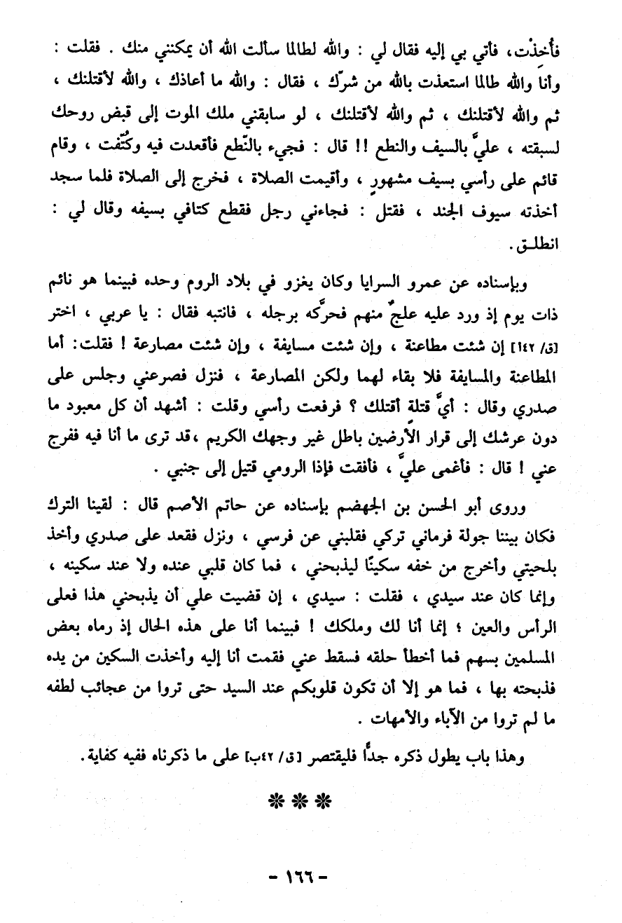 وبإسناده عن عمرو السرايا وكان يغزو في بلاد الروم وحده فبينما هو نائم ذات يوم إذ ورد عليه علجٌ منهم فحرَّكه برجله، فانتبه فَقَالَ: يا عربي، اختر إن شئت مطاعنة، وإن شئت مسايفة، وإن شئت مصارعة! فقلت: أما المطاعنة والمسايفة فلا بقاء لهما ولكن المصارعة، فنزل فصرعني وجلس عَلَى صدري وقال: أيَّ قتلة أقتلك؟ فرفعت رأسي وقلت: أشهد أن كل معبود ما دون عرشك إِلَى قرار الأرضين باطل غير وجهك الكريم، قد ترى ما أنا فيه ففرج عني! قال: فأغمى عَلَيَّ، فأفقت فإذا الرومي قتيل إِلَى جنبي.