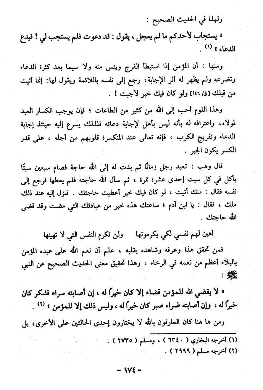 «لَا يَقْضِي اللَّهُ لِلْمُؤْمِنِ قَضَاءً إِلَّا كَانَ خَيْرًا لَهُ، وَإِنْ أَصَابَتْهُ سَرَّاءُ فَشَكَرَ كَانَ خَيْرًا لَهُ، وَإِنْ أَصَابَتْهُ ضَرَّاءُ صَبَرَ كَانَ خَيْرًا لَهُ، وَلَيْسَ ذَلِكَ إِلَّا لِلْمُؤْمِنِ» (¬2).