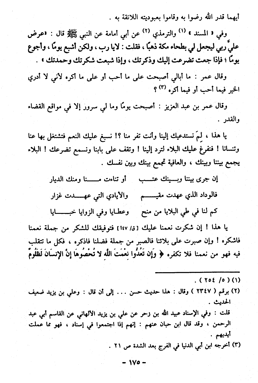 وفي "المسند" (¬1) والترمذي (¬2) عن أبي أمامة عن النبي صلّى الله عليه وسلم قال: "عَرْضَ عَلَيَّ رَبِّي لِيَجْعَلَ لِي بَطْحَاءَ مَكَّةَ ذَهَبًا، فَقُلْتُ: لَا يَا رَبِّ، وَلَكِنْ أَشْبَعُ يَوْمًا، وَأَجُوعُ يَوْمًا؛ فَإِذَا جُعْتُ تَضَرَّعْتُ إِلَيْكَ وَذَكَرْتُكَ، وَإِذَا شَبِعْتُ شَكَرْتُكَ وَحَمِدْتُكَ".