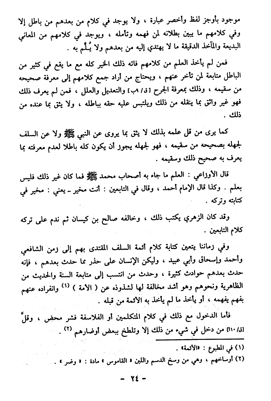 قال الأوزاعي: العِلْم ما جاء به أصحاب محمد - صلى الله عليه وسلم - فما كان غير ذلك فليس بعلم. وكذا قال الإمام أحمد، وقال في التابعين: أنت مخير -يعني: مخير في كابته وتركه.