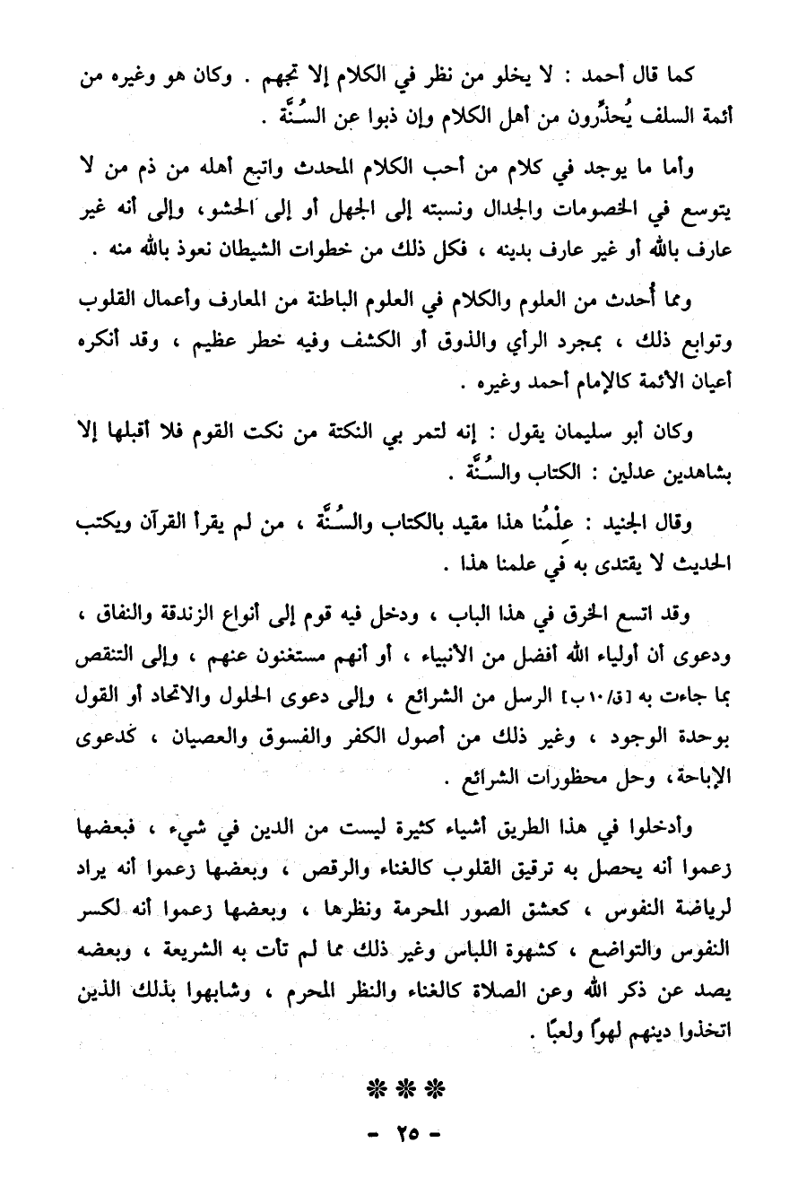 وأما ما يوجد في كلام من أَحَبّ الكلام المحدث واتبع أهله من ذم من لا يتوسع في الخصومات والجدال ونسبته إِلَى الجهل أو إِلَى الحشو، وإلى أنَّه غير عارف بالله أو غير عارف بدينه، فكل ذلك من خطوات الشيطان نعوذ بالله منه.