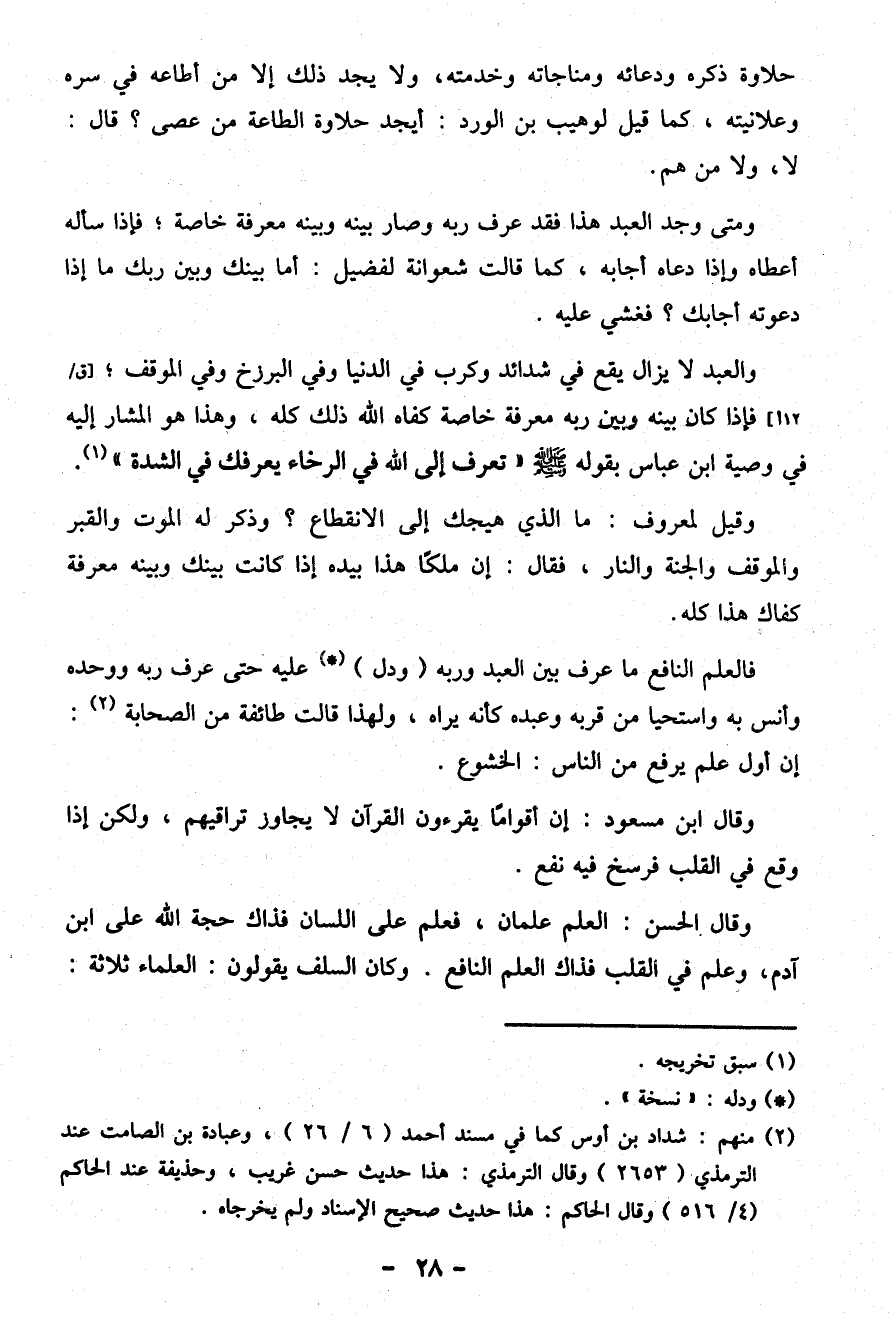 فالعلم النافع ما عرف بين العبد وربه (ودل) (*) عليه حتى عرف ربه ووحده وأنس به واستحيا من قربه وعبده كأنه يراه، ولهذا قالت طائفة من الصحابة (¬2): إن أول علم يرفع من الناس: الخشوع.
