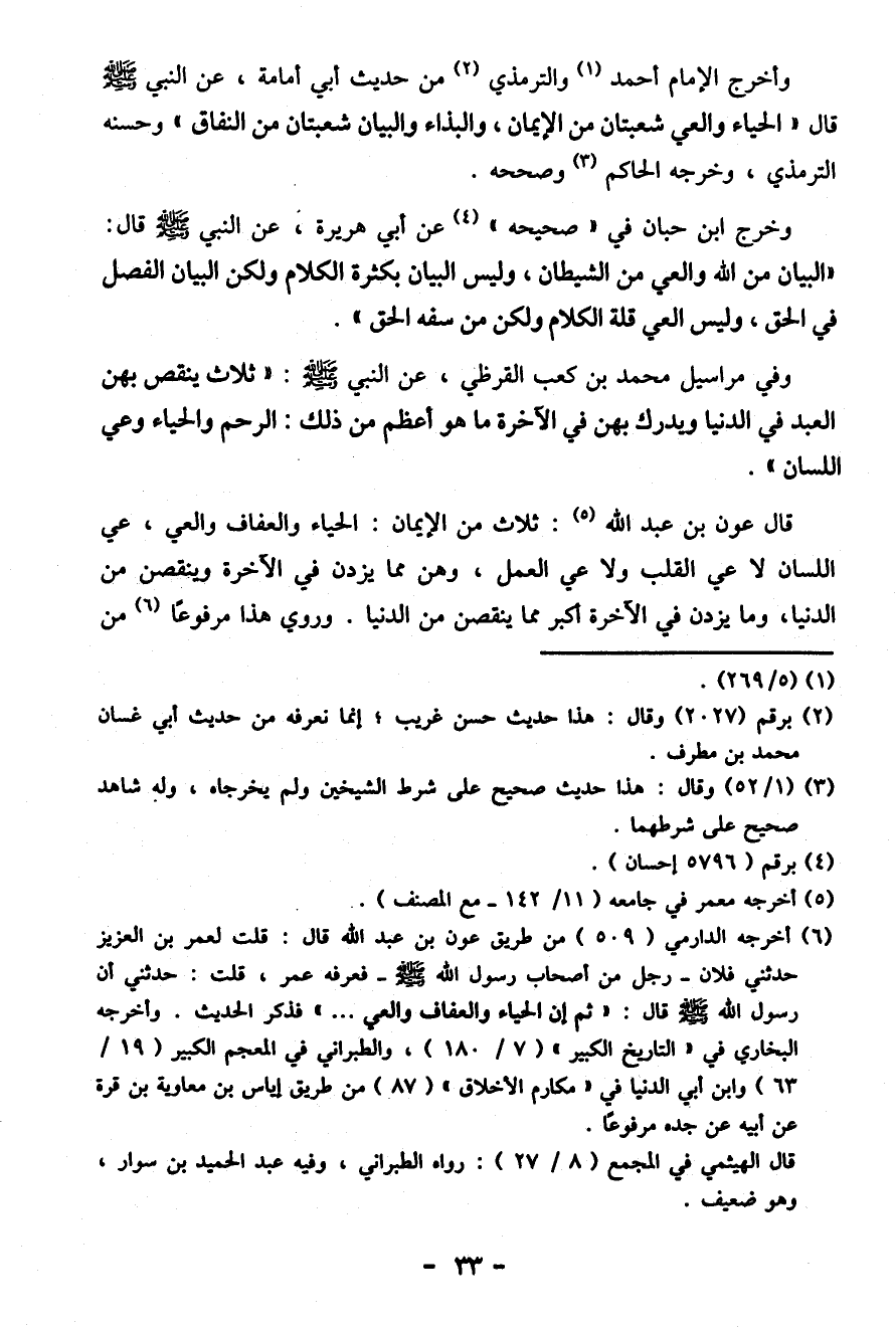 (¬6) أخرجه الدارمي (509) من طريق عون بن عبد الله قال: قلت لعمر بن العزيز حدثني فلان -رجل من أصحاب رسول الله - صلى الله عليه وسلم -- فعرفه عمر، قلت: حدثني أن رسول الله - صلى الله عليه وسلم - قال: "ثم إن الحياء والعفاف والعي ... " فذكر الحديث. وأخرجه البخاري في "التاريخ الكبير" (7/ 180)، والطبراني في المعجم الكبير (19/ 63) وابن أبي الدنيا في "مكارم الأخلاق" (87) من طريق إياس بن معاوية بن قرة عن أبيه عن جده مرفوعًا.