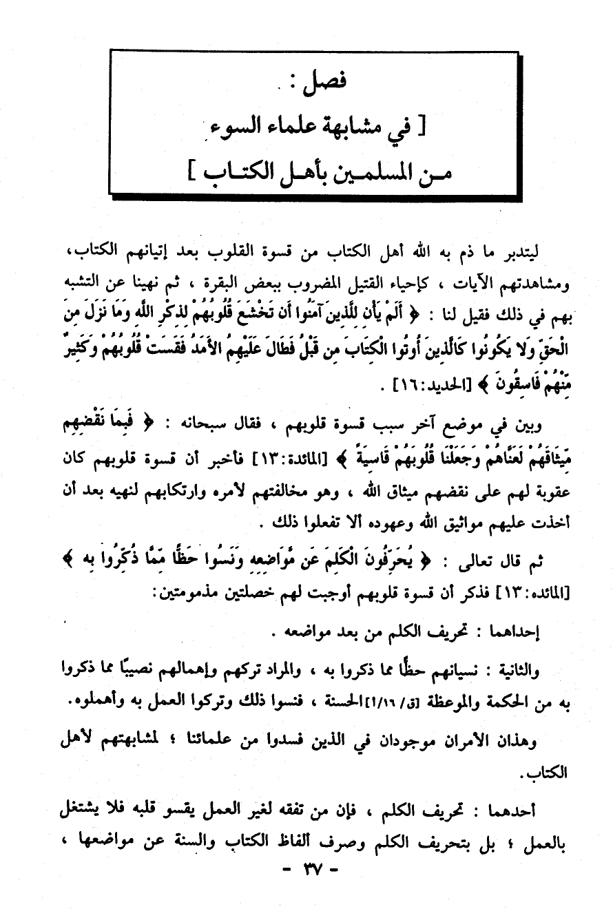 وهذان الأمران موجودان في الذين فسدوا من علمائنا، لمشابهتهم لأهل الكتاب.