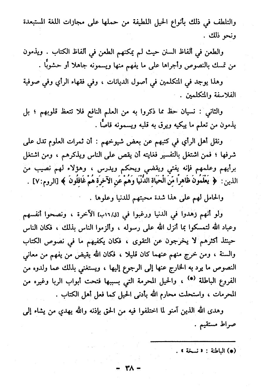 ولو أنهم زهدوا في الدُّنْيَا ورغبوا في الآخرة، ونصحوا أنفسهم وعباد الله لتمسكوا بما أنزل الله عَلَى رسوله، وألزموا الناس بذلك، فكان الناس حينئذ أكثرهم لا يخرجون عن التقوى، فكان يكفيهم ما في نصوص الكتاب والسنة، ومن خرج منهم عنهما كان قليلاً، فكان الله يقيض من يفهم من معاني النصوص ما يرد به الخارج عنها إِلَى الرجوع إليها، ويستغني بذلك عما ولدوه من الفروع الباطلة (*)، والحيل المحرمة التي بسببها فتحت أبواب الربا وغيره من المحرمًات، واستحلت محارم الله بأدنى الحيل كما فعل أهل الكتاب.