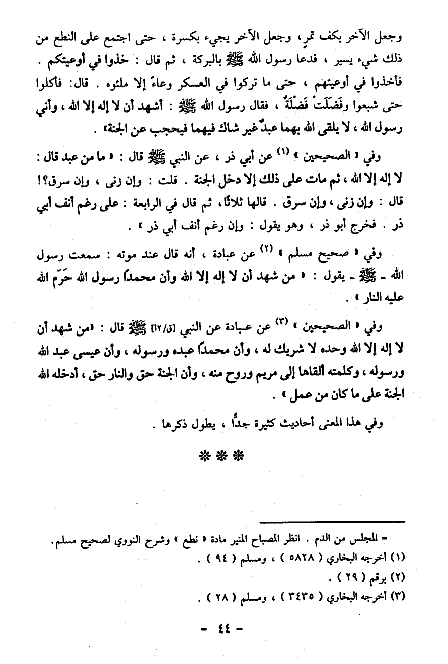 وَيَجِيءُ الْآخَرُ بِكَفِّ تَمْرٍ، وَجَعَلَ الْآخَرُ يَجِيءُ بِكَسْرَةٍ، حَتَّى اجْتَمَعَ عَلَى النِّطَعِ مِنْ ذَلِكَ شَيْءٌ يَسِيرٌ، فَدَعَا رَسُولُ اللهِ صَلَّى اللهُ عَلَيْهِ وَسَلَّمَ عَلَيْهِ بِالْبَرَكَةِ، ثُمَّ قَالَ: خُذُوا فِي أَوْعِيَتِكُمْ. فَأَخَذُوا فِي أَوْعِيَتِهِمْ، حَتَّى مَا تَرَكُوا فِي الْعَسْكَرِ وِعَاءً إِلَّا مَلَئُوهُ. قَالَ: فَأَكَلُوا حَتَّى شَبِعُوا وَفَضَلَتْ فَضْلَةٌ، فَقَالَ رَسُولُ اللهِ صَلَّى اللهُ عَلَيْهِ وَسَلَّمَ: أَشْهَدُ أَنْ لَا إِلَهَ إِلَّا اللهُ، وَأَنِّي رَسُولُ اللهِ، لَا يَلْقَى اللهَ بِهِمَا عَبْدٌ غَيْرَ شَاكٍّ فَيُحْجَبَ عَنِ الْجَنَّةِ».