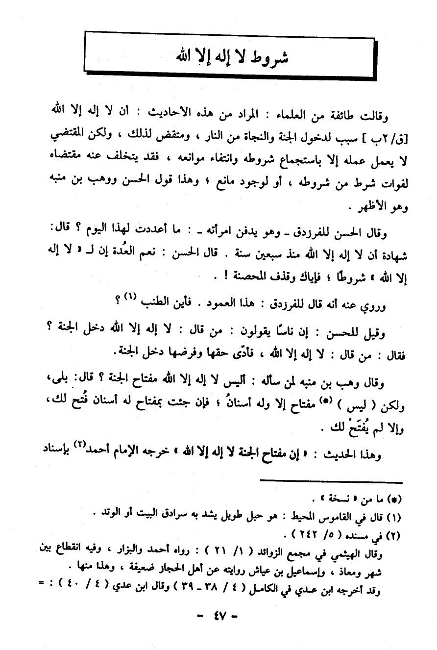 وقال الحسن للفرزدق -وهو يدفن امرأته-: ما أعددت لهذا اليوم؟ قال: شهادة أن لا إله إلا الله منذ سبعين سنة. قال الحسن: نعم العُدة إن لـ "لا إله إلا الله" شروطما؛ فإياك وقذف المحصنة!.