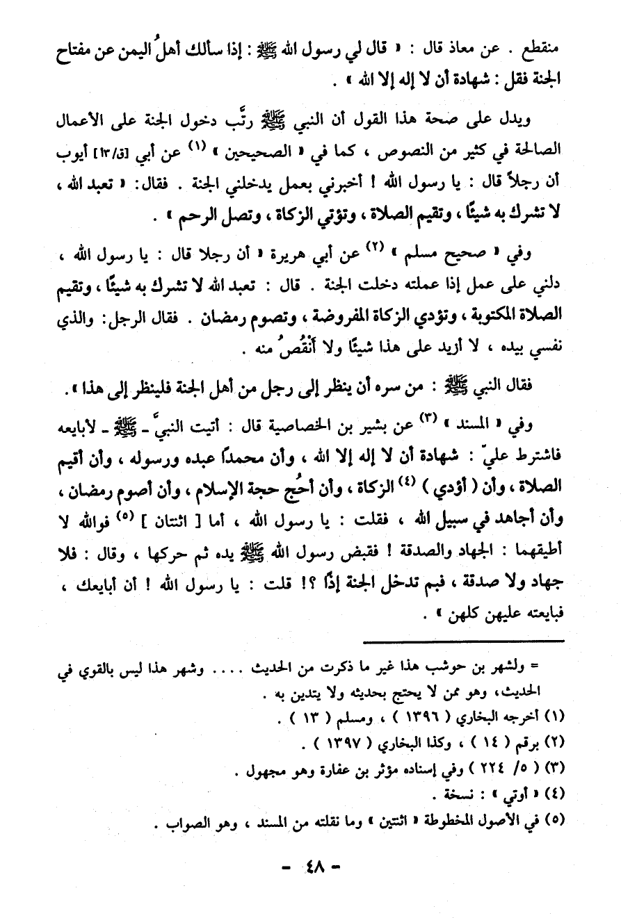 وفي "المسند" (¬3) عَنْ بَشِيرِ بْنِ الْخَصَاصِيَةِ قَالَ: «أَتَيْتُ النَّبِيَّ -صَلَّى اللَّهُ عَلَيْهِ وَسَلَّمَ- لِأُبَايِعَهُ فَاشْتَرَطَ عَلَيَّ: شَهَادَةَ أَنْ لَا إِلَهَ إِلَّا اللَّهُ، وَأَنَّ مُحَمَّدًا عَبْدُهُ وَرَسُولُهُ، وَأَنْ أُقِيمَ الصَّلَاةَ، وَأَنْ (أُؤَدِّي) (¬4) الزَّكَاةَ، وَأَنْ أَحُجَّ حَجَّةَ الْإِسْلَامِ، وَأَنْ أَصُومَ رَمَضَانَ، وَأَنْ أُجَاهِدَ فِي سَبِيلِ اللَّهِ، فَقُلْتُ: يَا رَسُولَ اللَّهِ، أَمَّا [اثْنَتَانِ] (¬5) فَوَاللَّهِ لاَ أُطِيقُهُمَا: الْجِهَادُ وَالصَّدَقَةُ! فَقَبَضَ رَسُولُ اللَّهِ صَلَّى اللَّهُ عَلَيْهِ وَسَلَّمَ يَدَهُ ثُمَّ حَرَّكَهَا، وَقَالَ: فَلَا جِهَادَ وَلَا صَدَقَةَ، فَبِمَ تَدْخُلُ الْجَنَّةَ إِذًا؟! قُلْتُ: يَا رَسُولَ اللَّهِ! أَنْ أُبَايِعُكَ، فَبَايَعْتُهُ عَلَيْهِنَّ كُلِّهِنَّ».