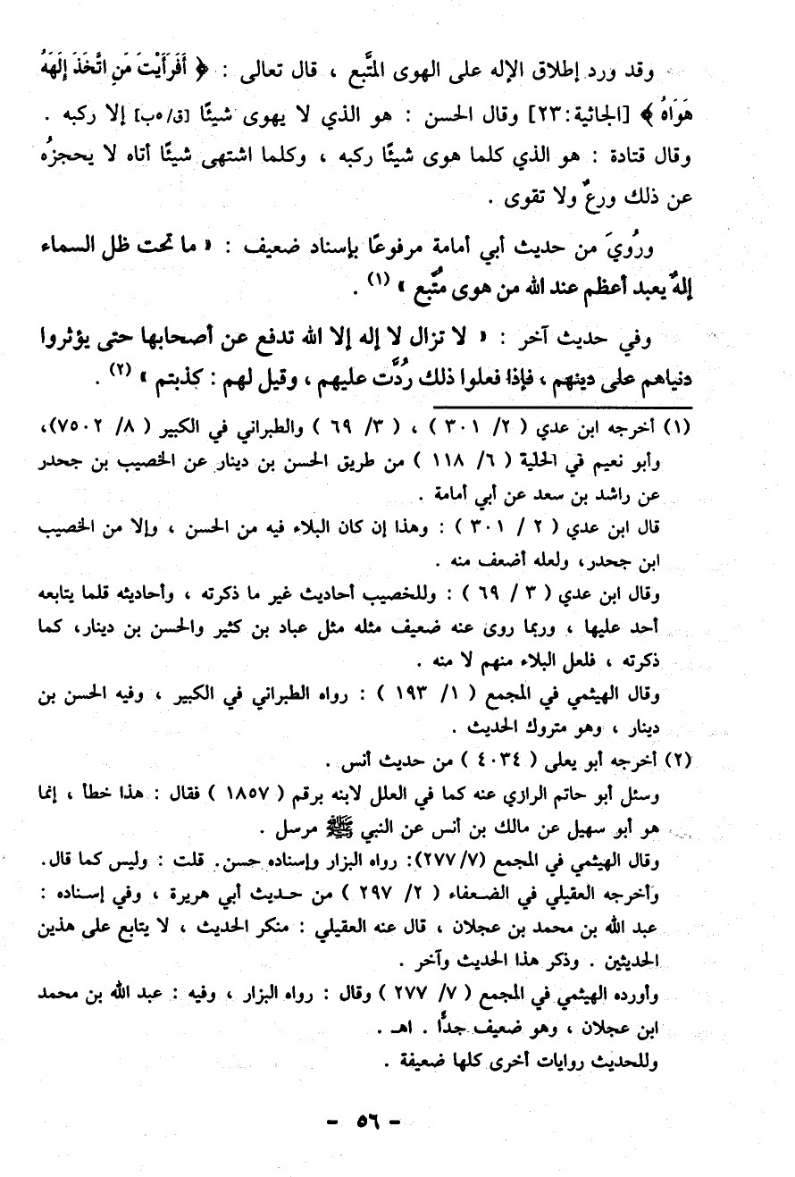 ورُوي من حديث أبي أمامة مرفوعًا بإسناد ضعيف: «مَا تَحْتَ ظِلِّ السَّمَاءِ إِلَهٌ يُعْبَدُ أَعْظَمُ عِنْدَ اللَّهِ مِنْ هَوًى مُتَّبَعٍ» (¬1).
