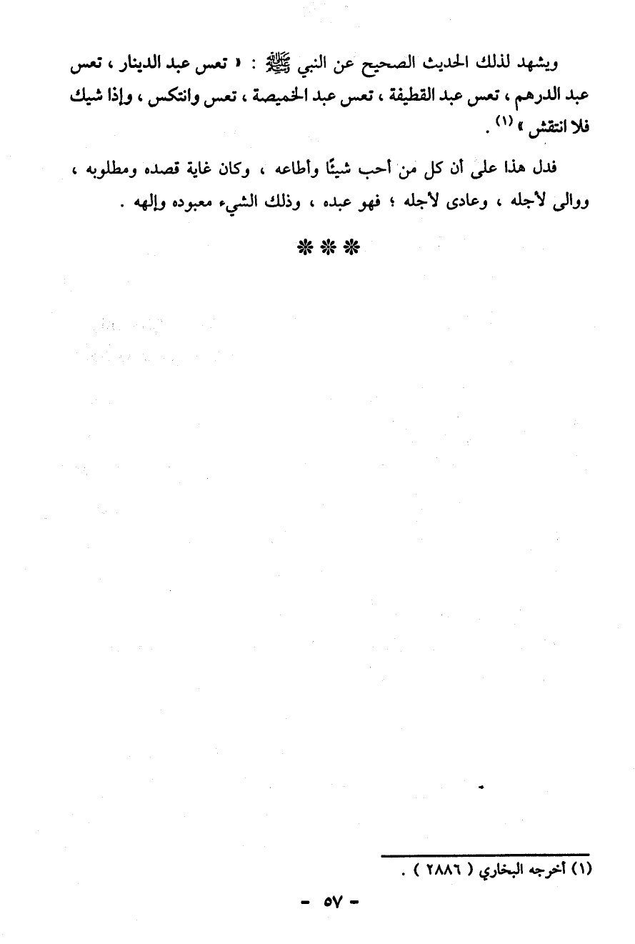ويشهد لذلك الحديث الصحيح عن النبي صلّى الله عليه وسلم: "تَعِسَ عَبْدُ الدِّينَارِ، تَعِسَ عَبْدُ الدِّرْهَمِ، تَعِسَ عَبْدُ الْقَطِيفَةِ، تَعِسَ عَبْدُ الْخَمِيصَةِ، تَعِسَ وَانْتَكَسَ، وَإِذَا شِيكَ فَلا انْتَقَشَ" (¬1).