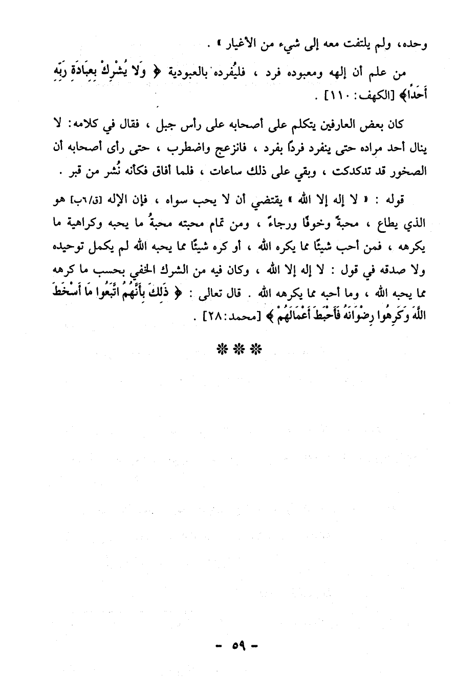 قوله: "لا إله إلا الله" يقتضي أن لا يحب سواه، فإن الإله هو الَّذِي يطاع، محبةً وخوفًا ورجاءً، ومن تمام محبته محبةُ ما يحبه وكراهية ما يكرهه، فمن أَحَبّ شيئًا مما يكره الله، أو كره شيئًا مما يحبه الله لم يكمل توحيده ولا صدقه في قول: لا إله إلا الله، وكان فيه من الشرك الخفي بحسب ما كرهه مما يحبه الله، وما أحبه مما يكرهه الله. قال تعالى: {ذَلِكَ بِأَنَّهُمُ اتَّبَعُوا مَا أَسْخَطَ اللَّهَ وَكَرِهُوا رِضْوَانَهُ فَأَحْبَطَ أَعْمَالَهُمْ} [محمد: 28].