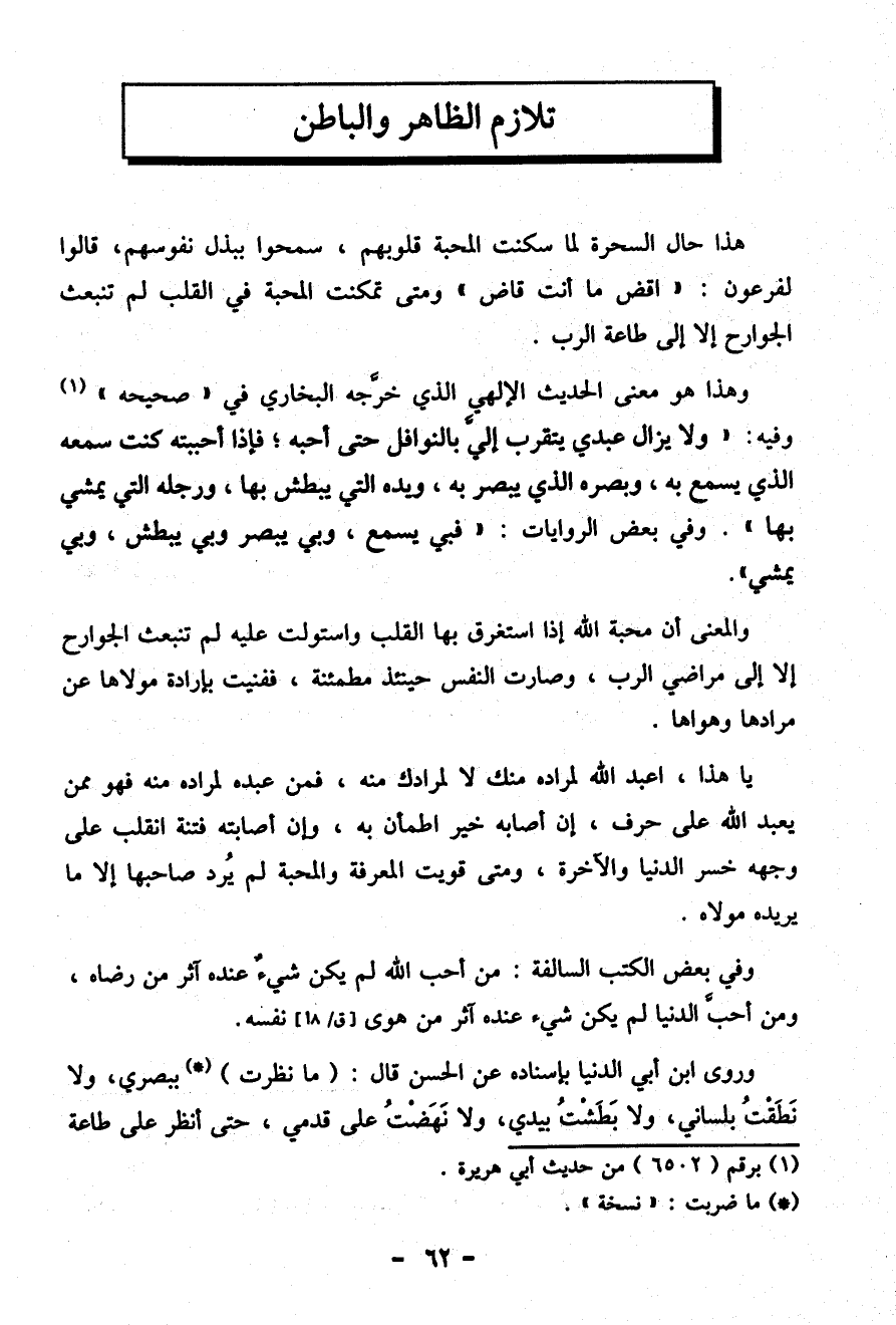 وهذا هو معنى الحديث الإلهي الَّذِي خرَّجه البخاري في "صحيحه" (¬1) وفيه: "وَلَا يَزَالُ عَبْدِي يَتَقَرَّبُ إِلَيَّ بِالنَّوَافِلِ حَتَّى أُحِبَّهُ؛ فَإِذَا أَحْبَبْتُهُ كُنْتُ سَمْعَهُ الَّذِي يَسْمَعُ بِهِ، وَبَصَرَهُ الَّذِي يُبْصِرُ بِهِ، وَيَدَهُ الَّتِي يَبْطِشُ بِهَا، وَرِجْلَهُ الَّتِي يَمْشِي بِهَا". وفي بعض الروايات: "فبي يسمع وبي يبصر وبي يبطش، وبي يمشي".