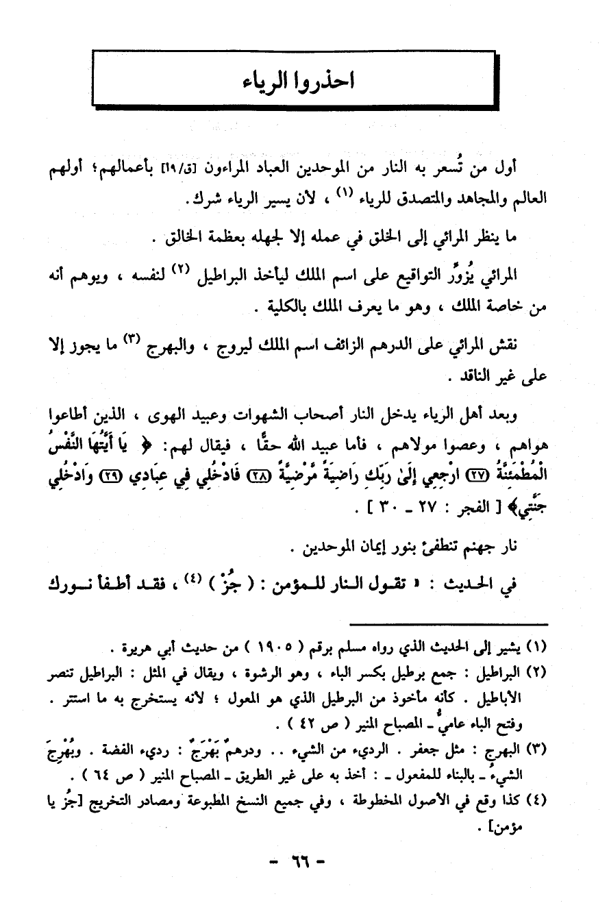 أول من تُسعر به النار من الموحدين العباد المراءون بأعمالهم؛ أولهم العالم والمجاهد والمتصدق للرياء (¬1)؛ لأنّ يسير الرياء شرك.