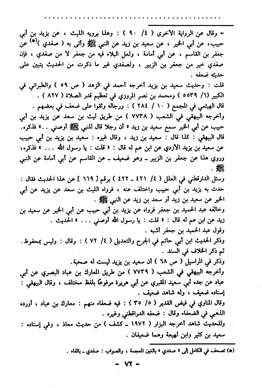 =وقال عن الرواية الأخرى (4/ 90): وهذا يرويه الليث، عن يزيد بن أبي حبيب، عن أبي الخير، عن سعيد بن زيد عن النبي صلّى الله عليه وسلم وأتى به (صفدي) (*) عن جعفر بن القاسم، عن أبي أمامة، ولعل البلاء فيه من جعفر لا من صفدي، فإن صفدي خير من جعفر بن الزبير، ولصفدي غير ما ذكرت من الحديث يتبين عَلَى حديثه ضعفه.