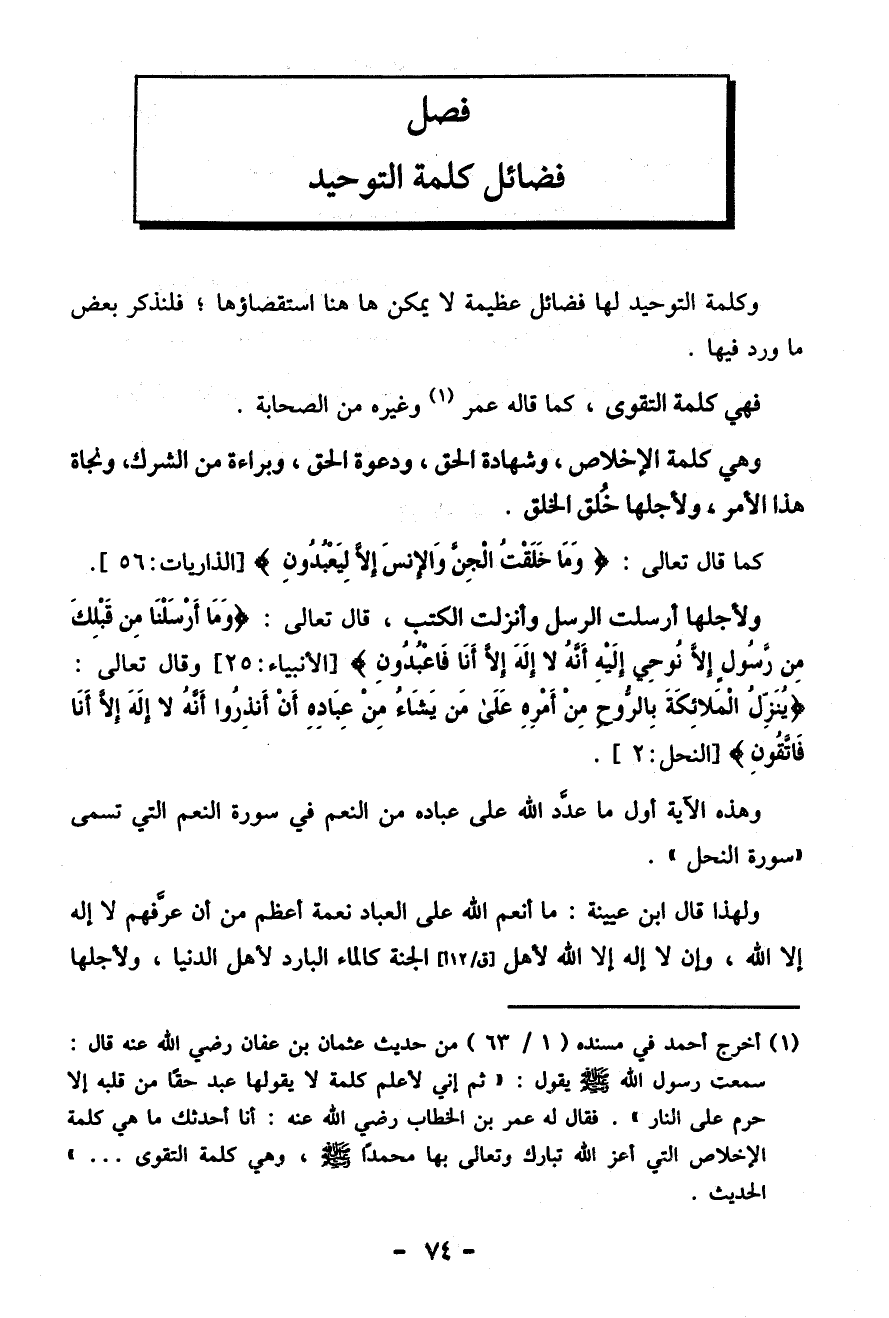 ولأجلها أرسلت الرسل وأنزلت الكتب، قال تعالى: {وَمَا أَرْسَلْنَا مِنْ قَبْلِكَ مِنْ رَسُولٍ إِلَّا نُوحِي إِلَيْهِ أَنَّهُ لَا إِلَهَ إِلَّا أَنَا فَاعْبُدُونِ} [الأنبياء: 25] وقال تعالى: {يُنَزِّلُ الْمَلَائِكَةَ بِالرُّوحِ مِنْ أَمْرِهِ عَلَى مَنْ يَشَاءُ مِنْ عِبَادِهِ أَنْ أَنْذِرُوا أَنَّهُ لَا إِلَهَ إِلَّا أَنَا فَاتَّقُونِ} [النحل: 2].