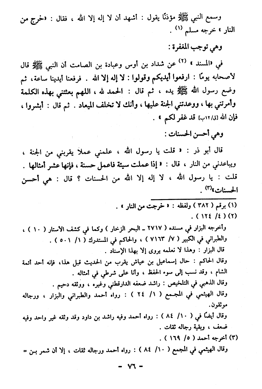قال أبو ذَرٍّ: "قُلْتُ يَا رَسُولَ اللَّهِ، عَلِّمْنِي عَمَلًا يُقَرِّبُنِي مِنَ الْجَنَّةِ، وَيُبَاعِدُنِي مِنَ النَّارِ، قَالَ: "إِذَا عَمِلْتَ سَيِّئَةً فَاعْمَلْ حَسَنَةً، فَإِنَّهَا عَشْرُ أَمْثَالِهَا. قُلْتُ: يَا رَسُولَ اللَّهِ، لَا إِلَهَ إِلَّا اللَّهُ مِنَ الْحَسَنَاتِ؟ قَالَ: هِيَ أَحْسَنُ الْحَسَنَاتِ" (¬3).