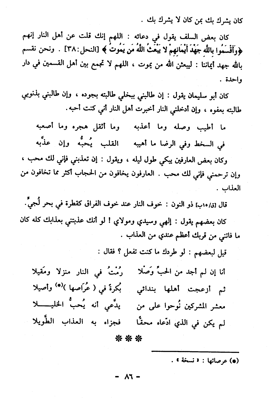 وكان بعض العارفين يبكي طول ليله، ويقول: إن تعذبني فإني لك محب، وإن ترحمني فإني لك محب. العارفون يخافون من الحجاب أكثر مما تخافون من العذاب.