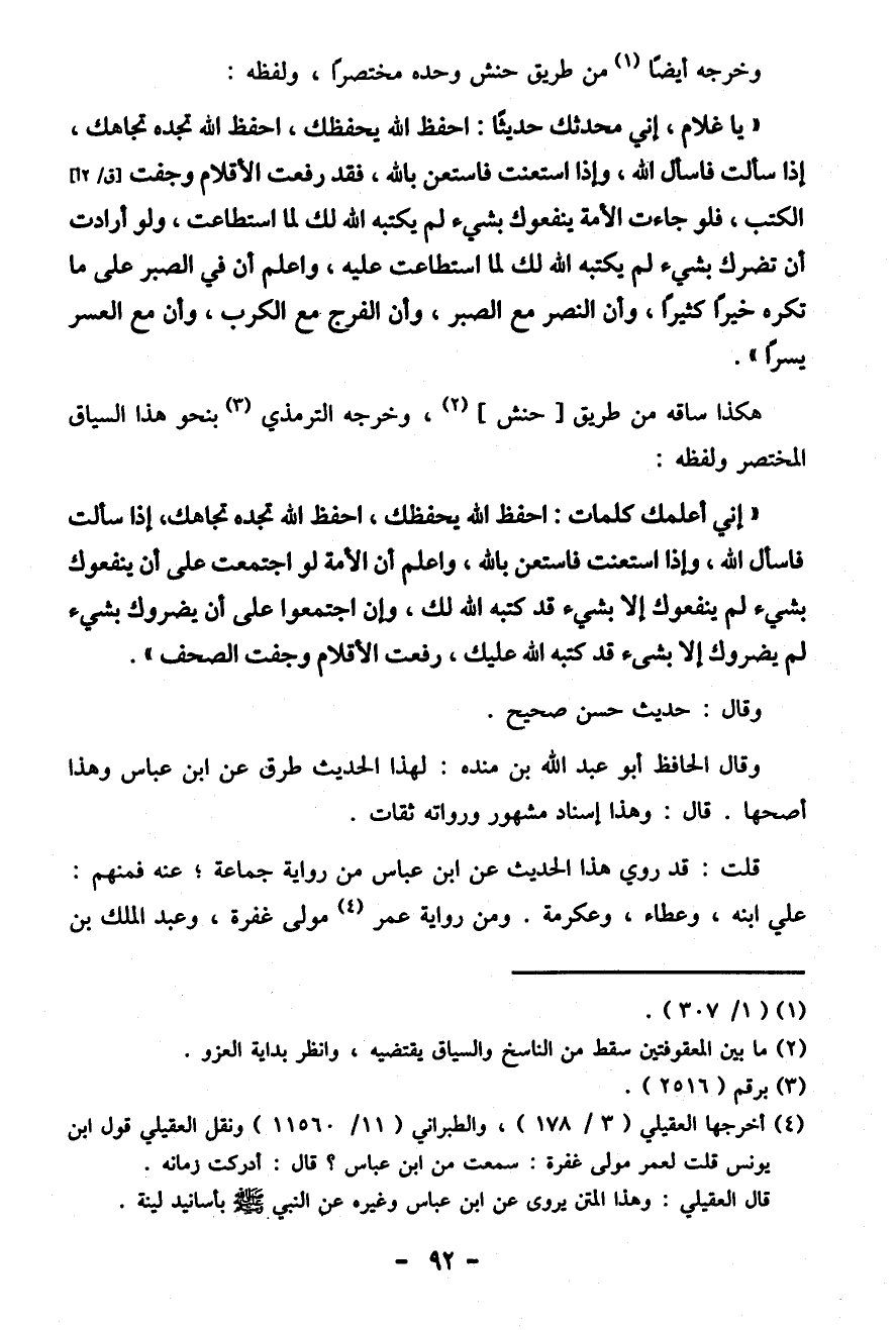 "يَا غُلامُ، إِنِّي مُحَدِّثُكَ حَدِيثًا: احْفَظِ اللهَ يَحْفَظْكَ، احْفَظِ اللهَ تَجِدْهُ تُجَاهَكَ، إِذَا سَأَلْتَ فَاسْأَلِ اللهَ، وَإِذَا اسْتَعَنْتَ فَاسْتَعِنْ بِاللهِ، فَقَدْ رُفِعَتِ الأَقْلاَمُ وَجُفَّتِ الكُتُبِ، فَلَوْ جَاءَتِ الأُمَّةُ يَنْفَعُوكَ بِشَيْءٍ لَمْ يَكْتُبْهُ اللهُ لَكَ لَمَا اسْتَطَاعَتْ، وَلَوْ أَرَادَتْ أنْ تَضُرَّكَ بِشَيءٍ لَمْ يَكْتُبُهُ اللهُ لَكَ لَمَا اسْتَطَاعَتْ عَلَيهِ، وَاعْلَمْ أَنَّ فِي الصَّبْرِ عَلَى مَا تَكْرَهُ خَيْرًا كَثِيرًا، وَأَنَّ النَّصْرَ مَعَ الصَّبْرِ، وَأَنَّ الْفَرَجَ مَعَ الْكَرْبِ، وَأَنَّ مَعَ الْعُسْرِ يُسْرًا".