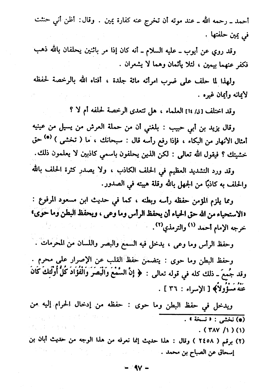 ومما يلزم المؤمن حفظه رأسه وبطنه، كما في حديث ابن مسعود المرفوع: "الِاسْتِحْيَاءَ مِنَ اللَّهِ حَقَّ الحَيَاءِ أَنْ تَحْفَظَ الرَّأْسَ وَمَا وَعَى، وَيَحْفَظِ البَطْنَ وَمَا حَوَى" خرجه الإمام أحمد (¬1) والترمذي (¬2).